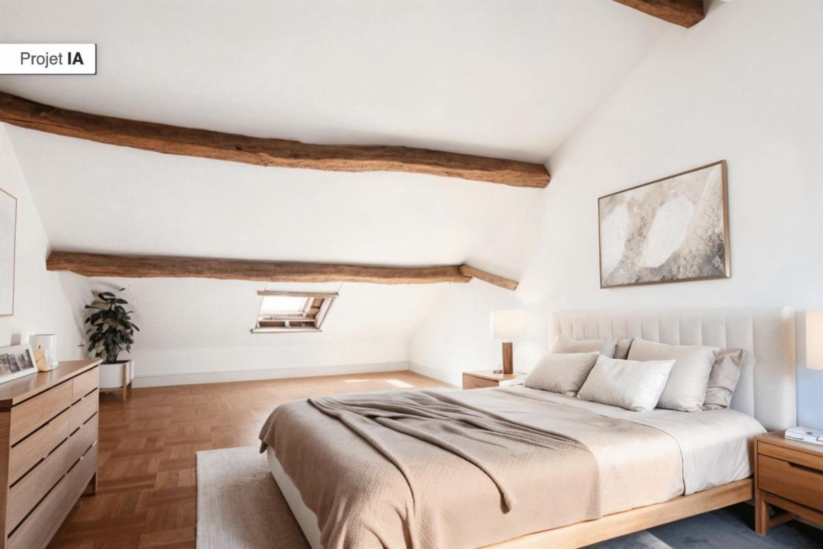 - Un étage comprenant : deux chambres avec placards, dont une avec un escalier fixe menant à un grenier non aménagé.