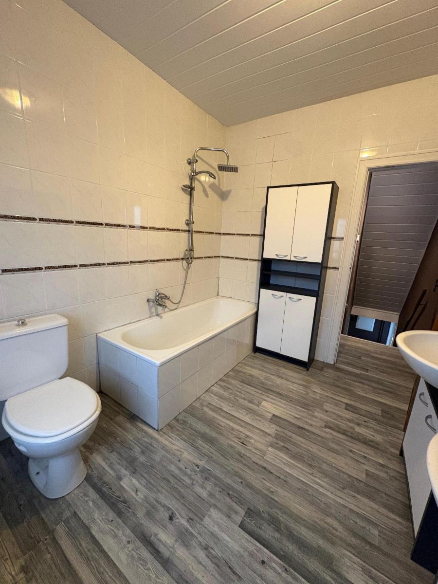 À l’étage, vous trouverez deux chambres et une salle de bain avec baignoire, double lavabo et WC.