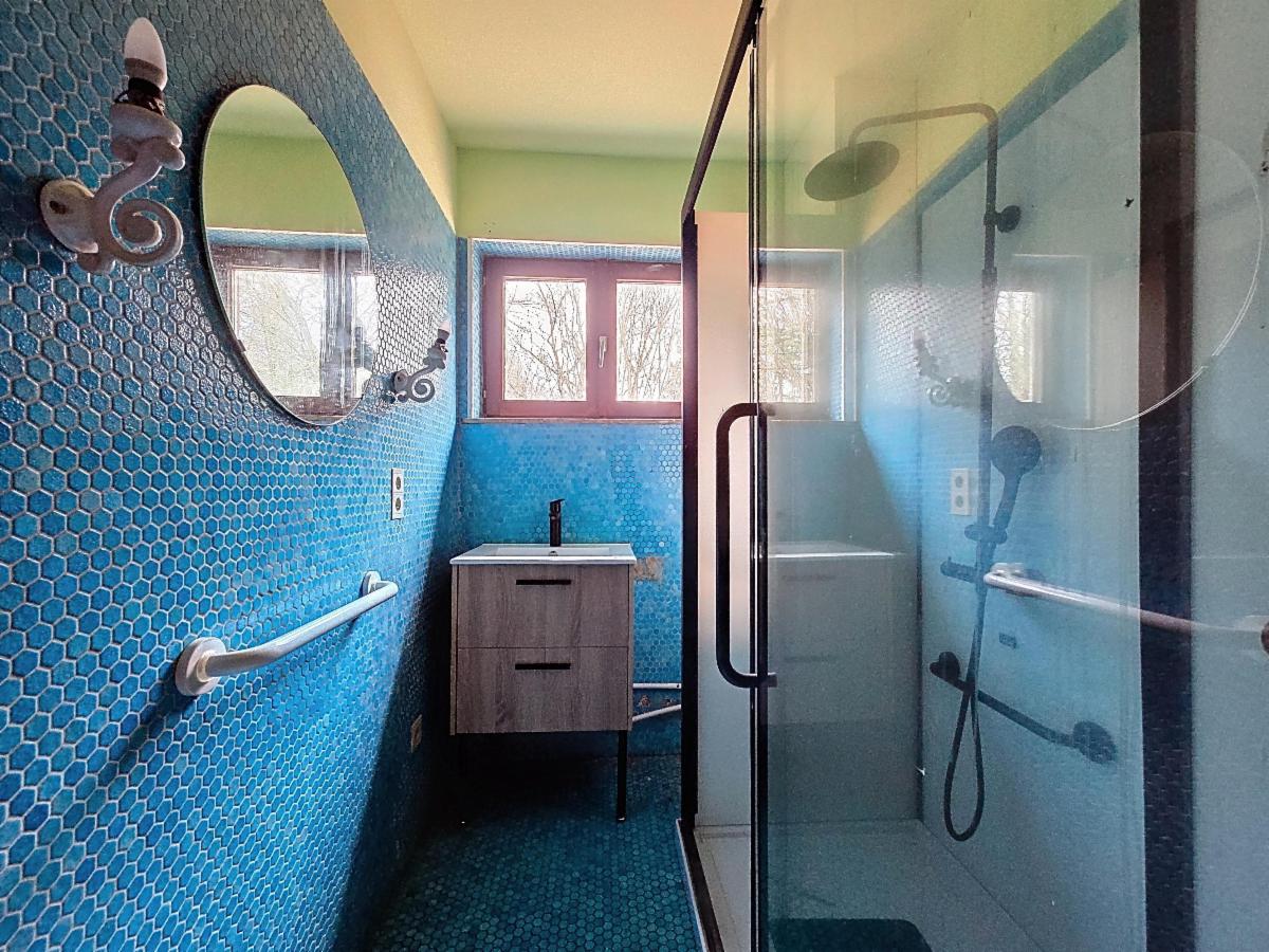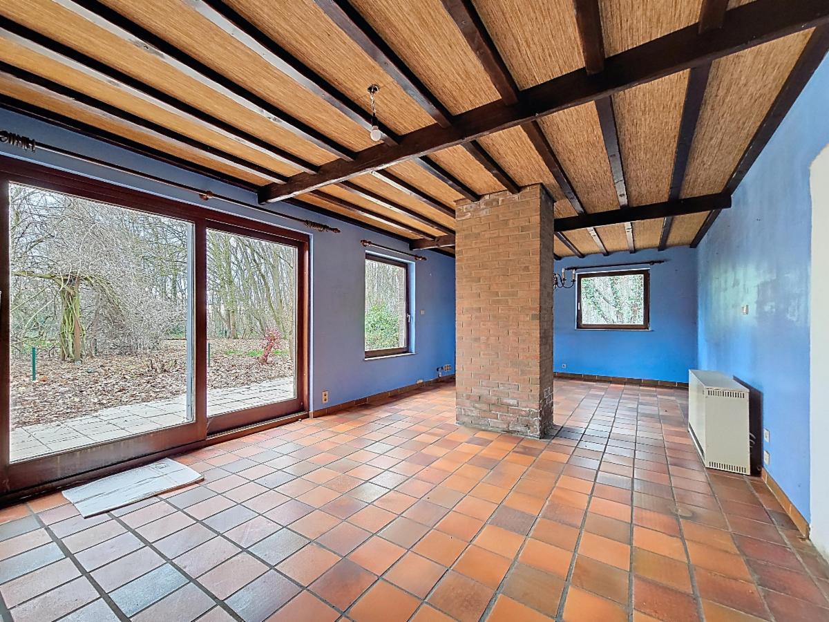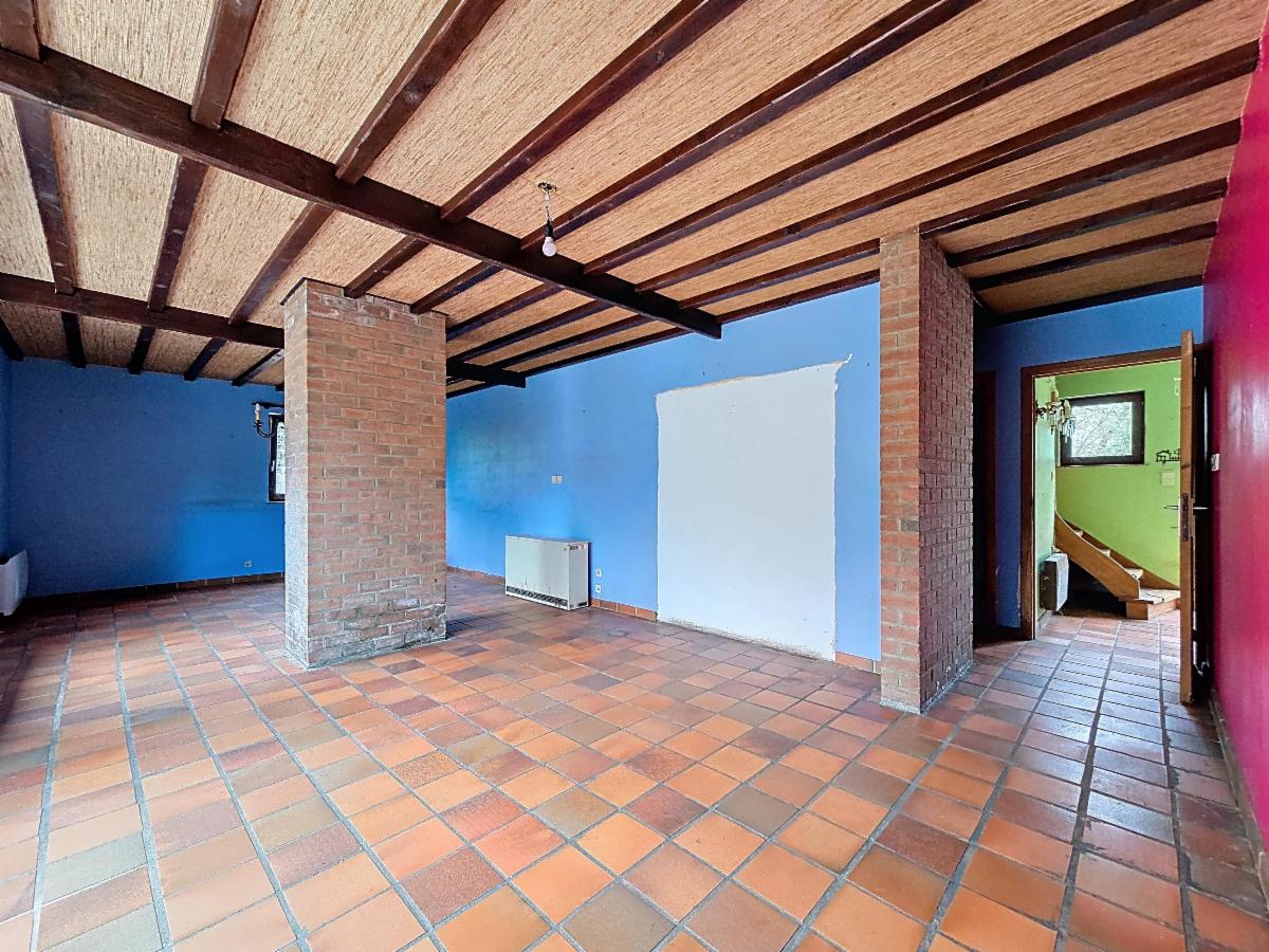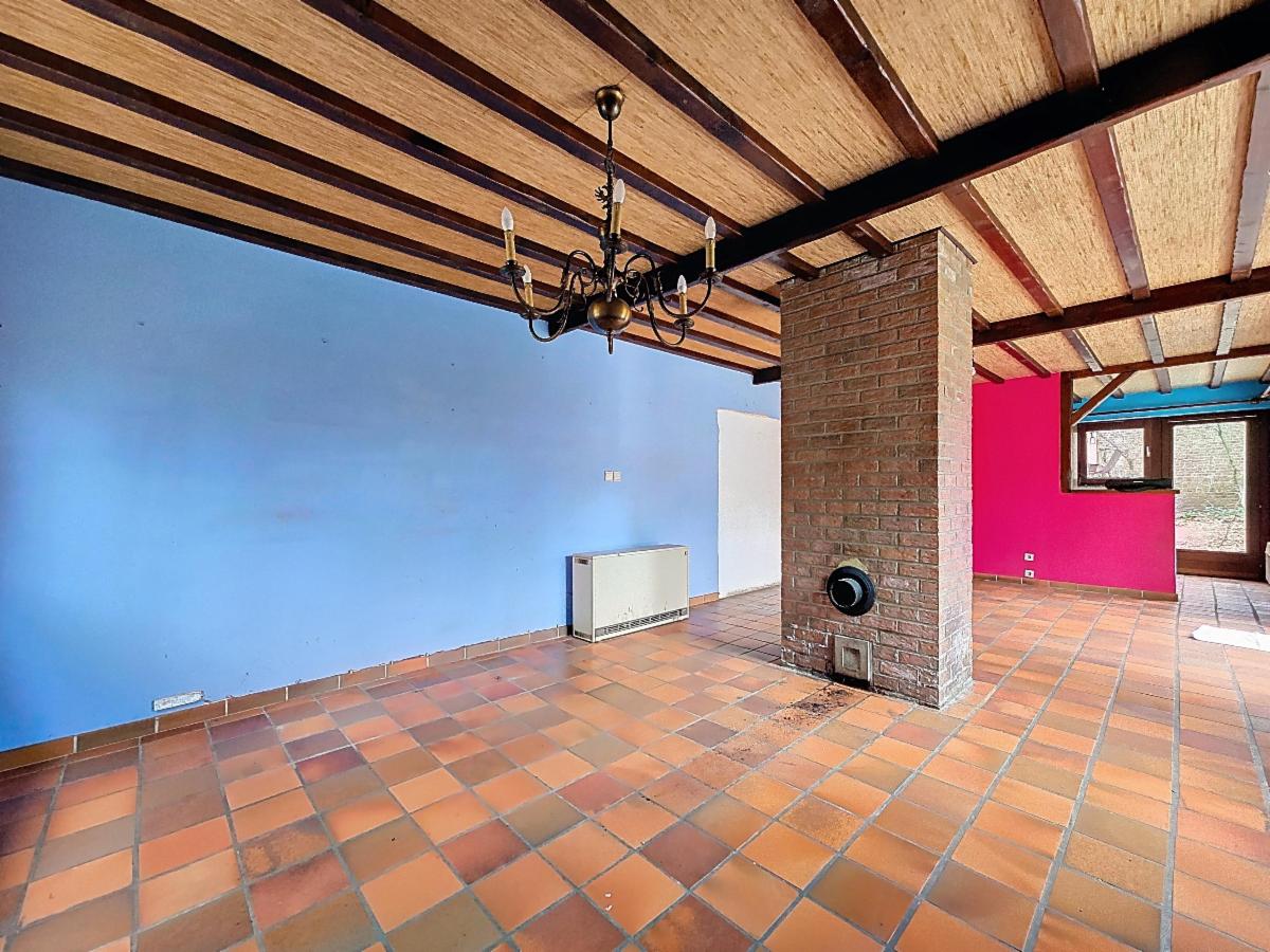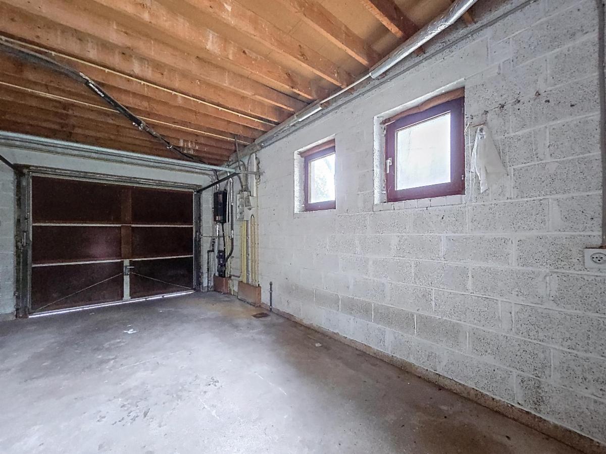 Hall d’entrée desservant un vaste séjour lumineux en espace ouvert (salon/salle à manger) de 35 m², une cuisine semi-équipée avec accès direct au garage (± 20 m²), une chambre de 13 m², ainsi qu’une salle de bains composée d’un meuble lavabo simple vasque et d’une douche.
