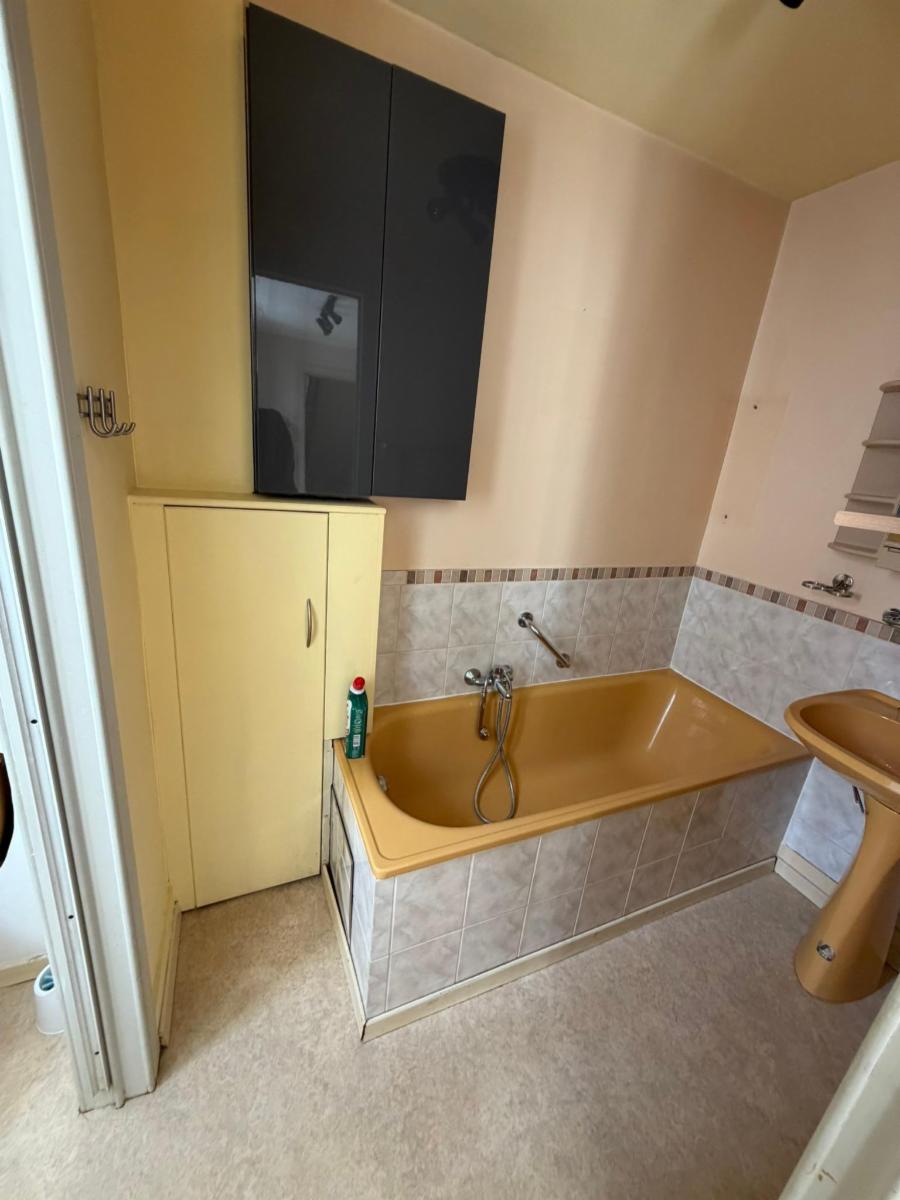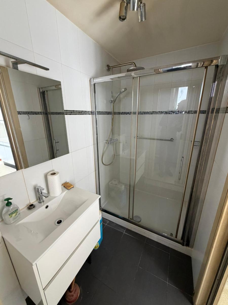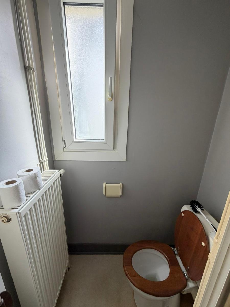 - Rez-de-chaussée: Living, cuisine, terrasse en bois, wc et salle de douche avec évier.