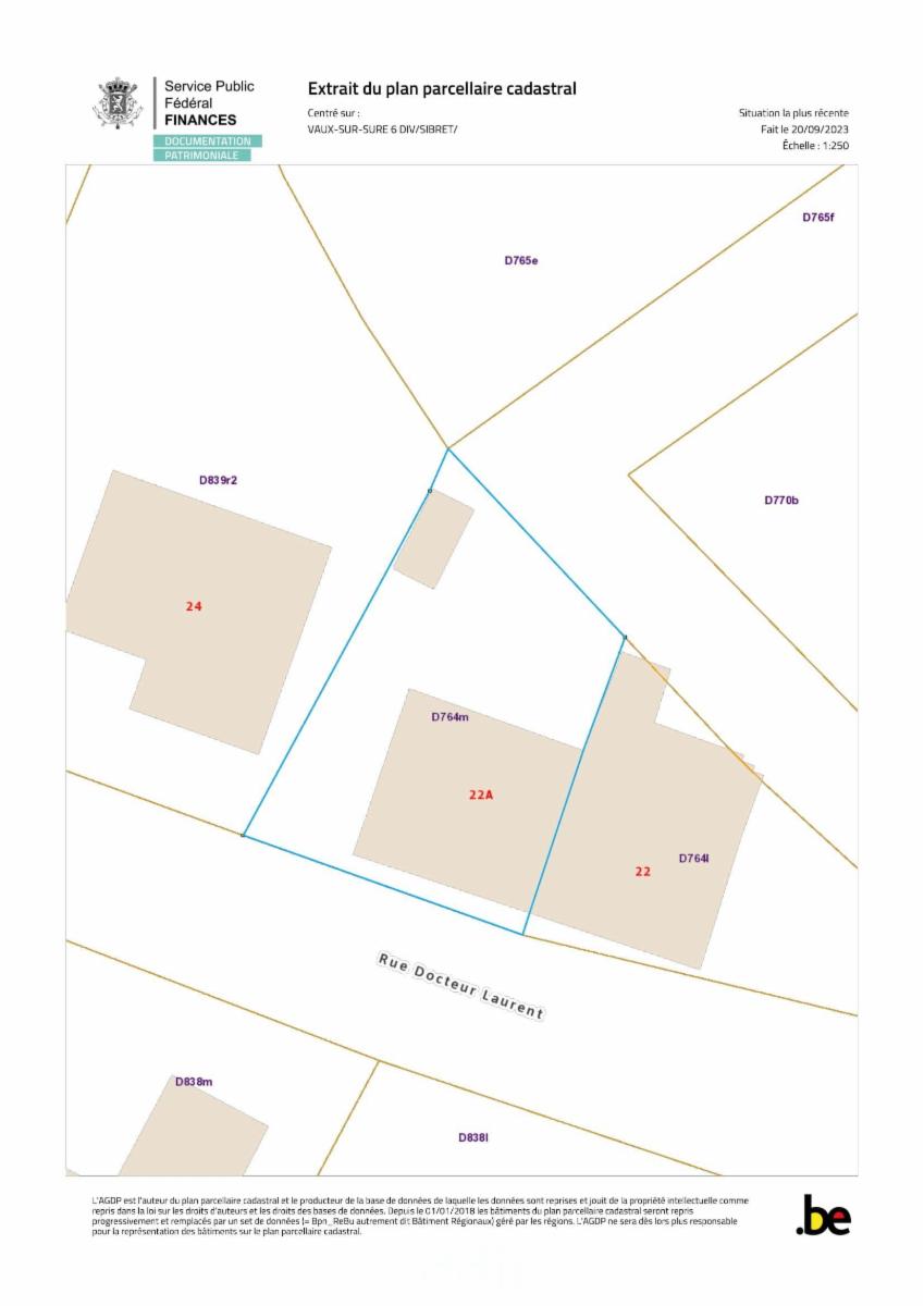 LOT 1 : Maison d'habitation plain-pied 3 façades "rue Docteur Laurent 22A", cadastrée Commune de VAUX-SUR-SÛRE 6ème division Sibret (82026) section D n° 0764MP0000, de 1978, RC 592€, sur et avec terrain de 02a 60ca, comprenant : hall d'entrée avec escalier, cuisine semi équipée (pas de frigo), salle à manger, chambre, salle de bains (évier, douche), buanderie-chaufferie ; étage : grenier aménageable non isolé accessible par escalier fixe ; pas de cave. Equipements : toiture ardoise, chauffage central mazout, châssis PVC double vitrage avec volets manuels, électricité non conforme, PEB D, revêtement façades en plastique imitation briques, égouts. Extérieur : cour, jardin et garage.