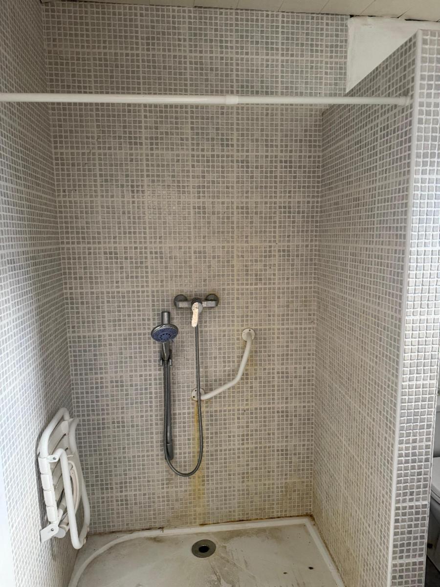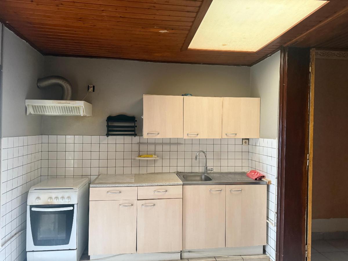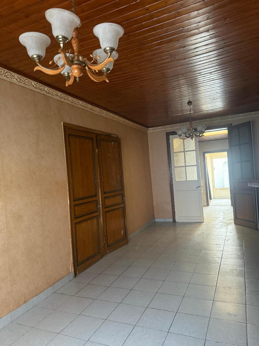 Rez-de-chaussée : Couloir d'entrée, grande pièce de vie, cuisine meublée avec espace repas et convecteur au gaz sous plateforme, salle d'eau (douche, lavabo, WC), cour arrière lumineuse.