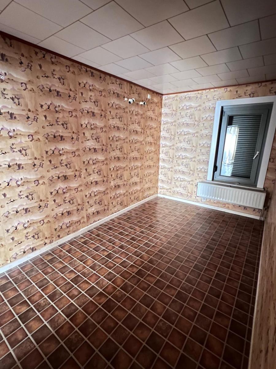 RDC : grande pièce à l'avant de la maison, couloir, salon - salle à manger, cuisine semi-équipée avec coin salle de bains.