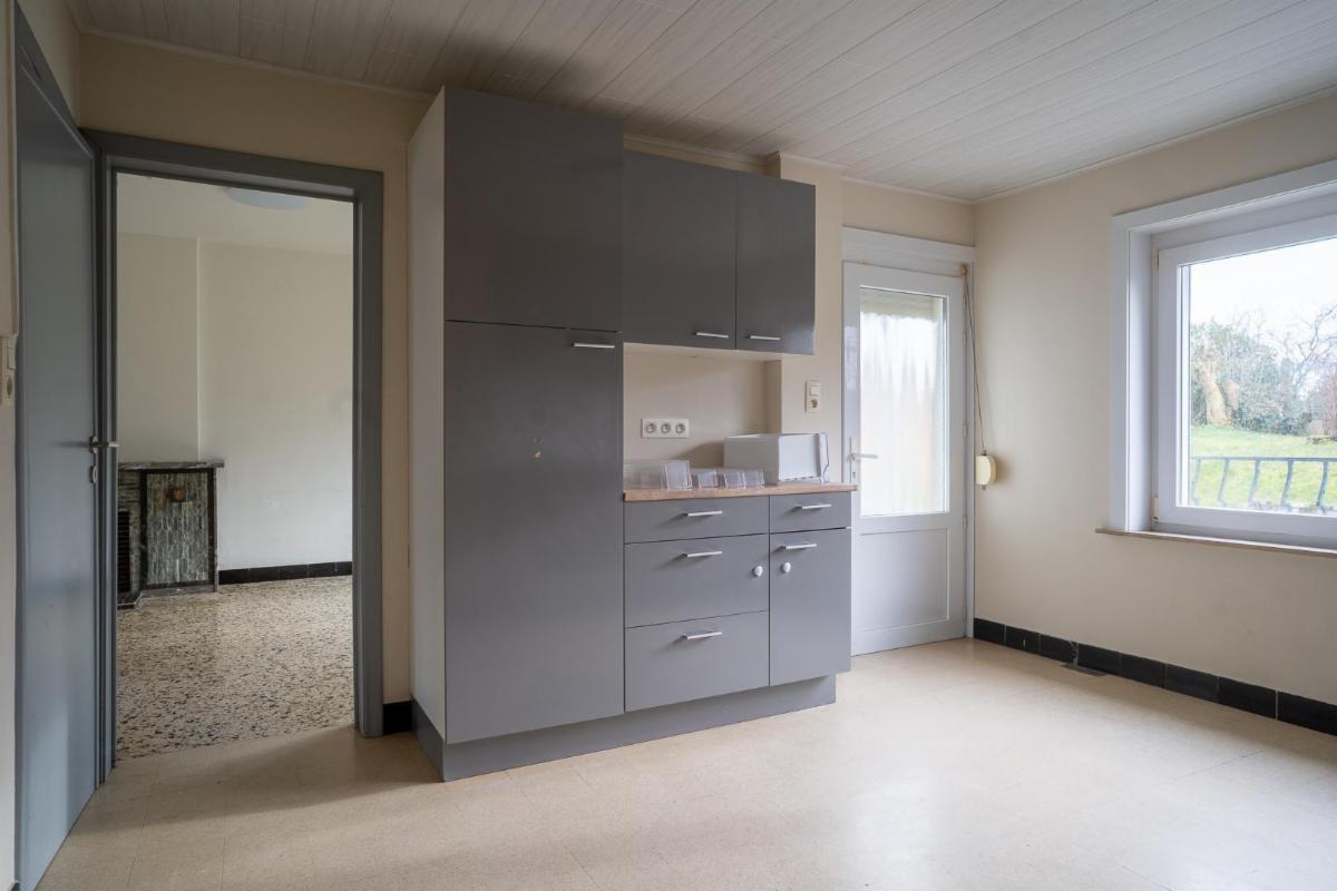 - Au rez-de-chaussée : un hall d'entrée, un living (salon + salle à manger), une cuisine semi équipée, une salle de bain (baignoire, vasque, WC), une grande chambre.