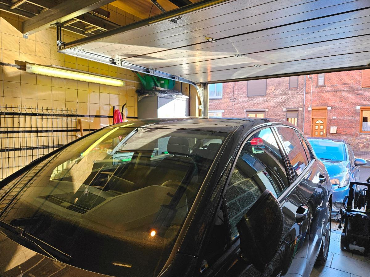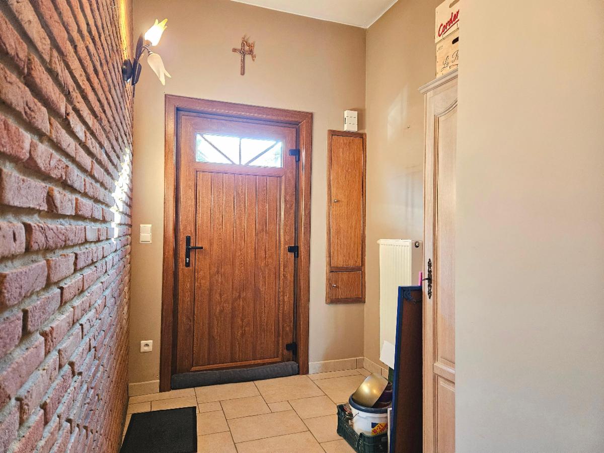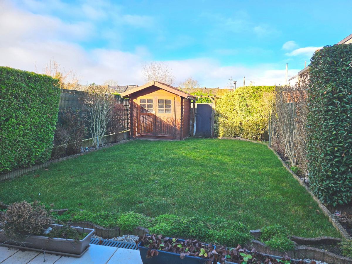 Extérieur : terrasse et petit jardin, parking une voiture en façade.