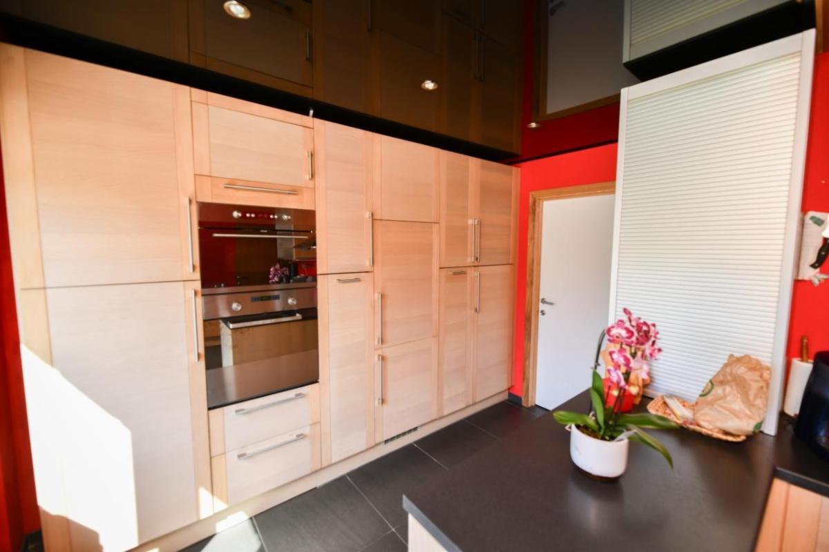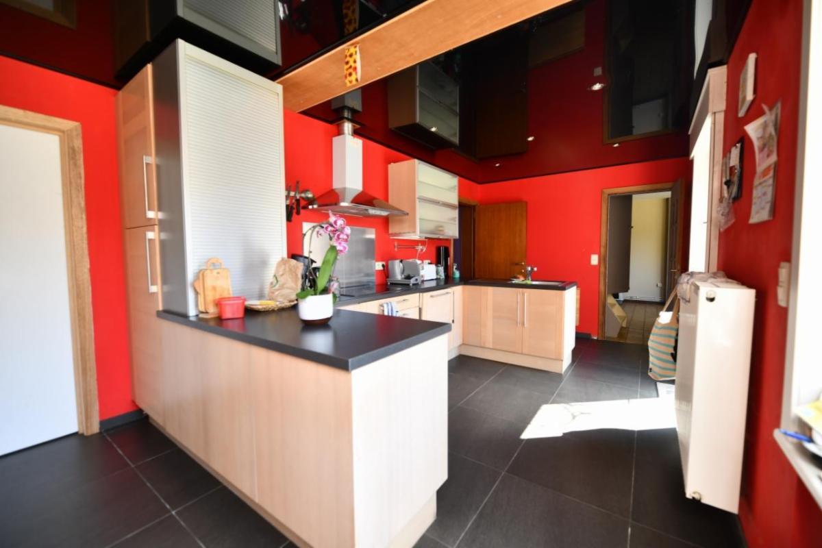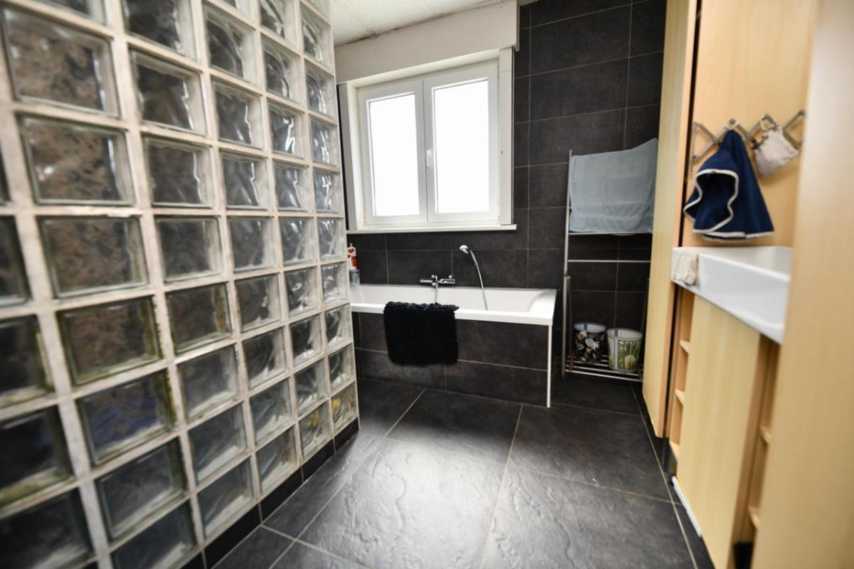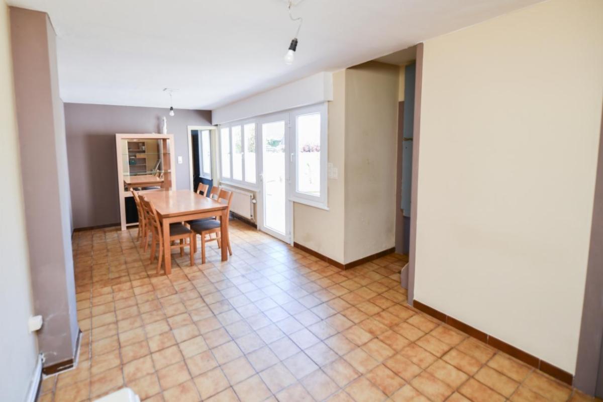 Au rez-de-chaussée : un hall d’entrée, un salon avant, une cuisine équipée en bon état, une salle à manger, une salle de bains (baignoire, douche, lavabo et aération avec wc indépendant), une buanderie/espace technique, un garage (étroit avec eau et électricité), une petite chaufferie (chaudière et cuve) ;