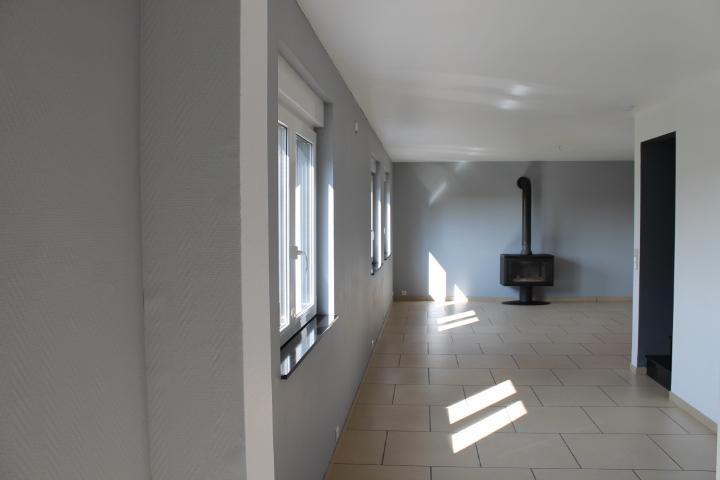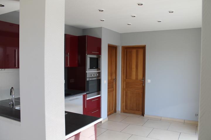 Rez: hall, wc, salon, salle à manger avec insert à bois, cuisine équipée, salle de douche avec wc et buanderie.
