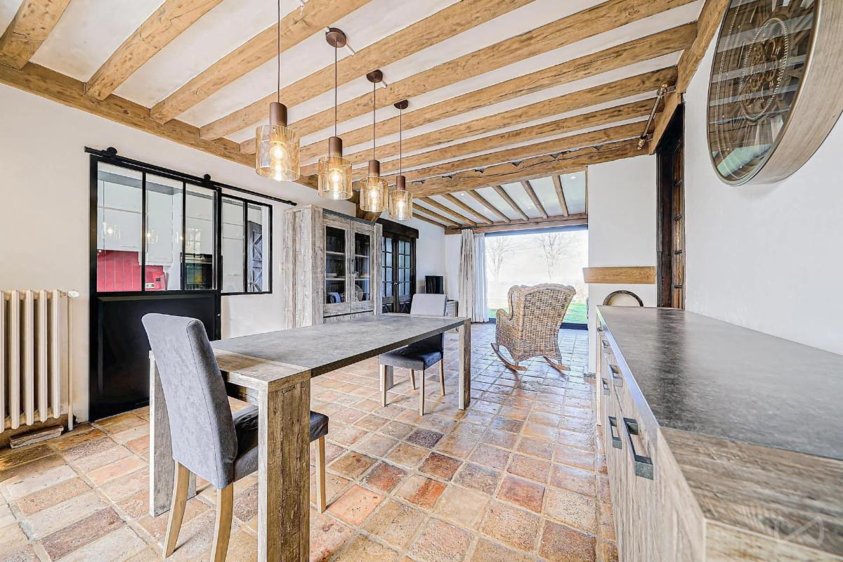Caractéristiques : béton isolé entre les niveaux, vide sanitaire sous toute la maison, toiture et corniches rénovées (isolation de 20 cm), chauffage central au mazout avec radiateurs en fonte et vannes thermostatiques, double vitrage en bois,