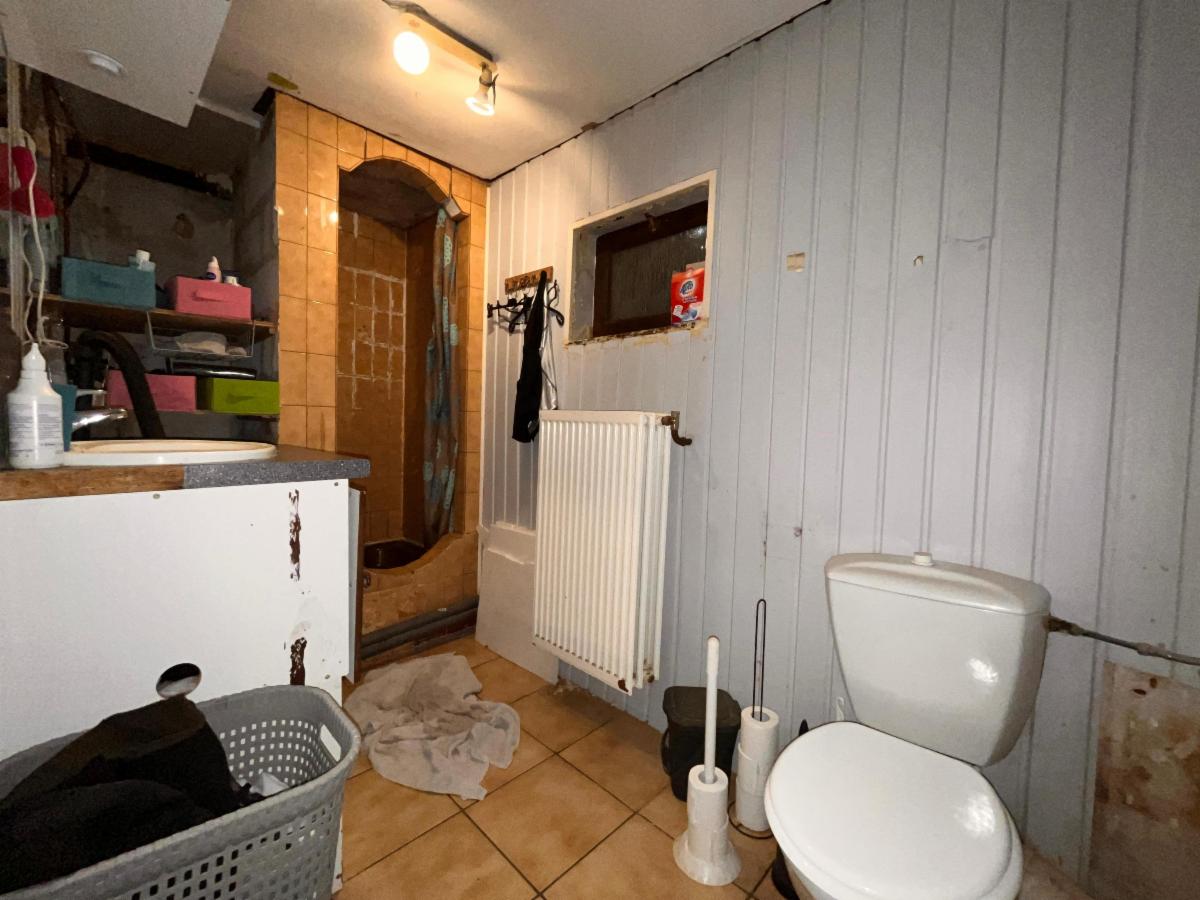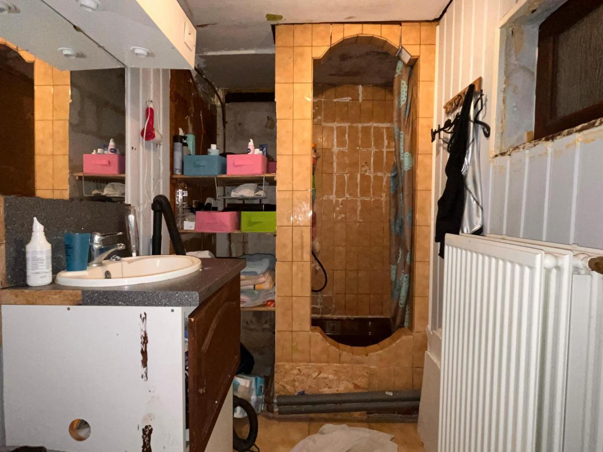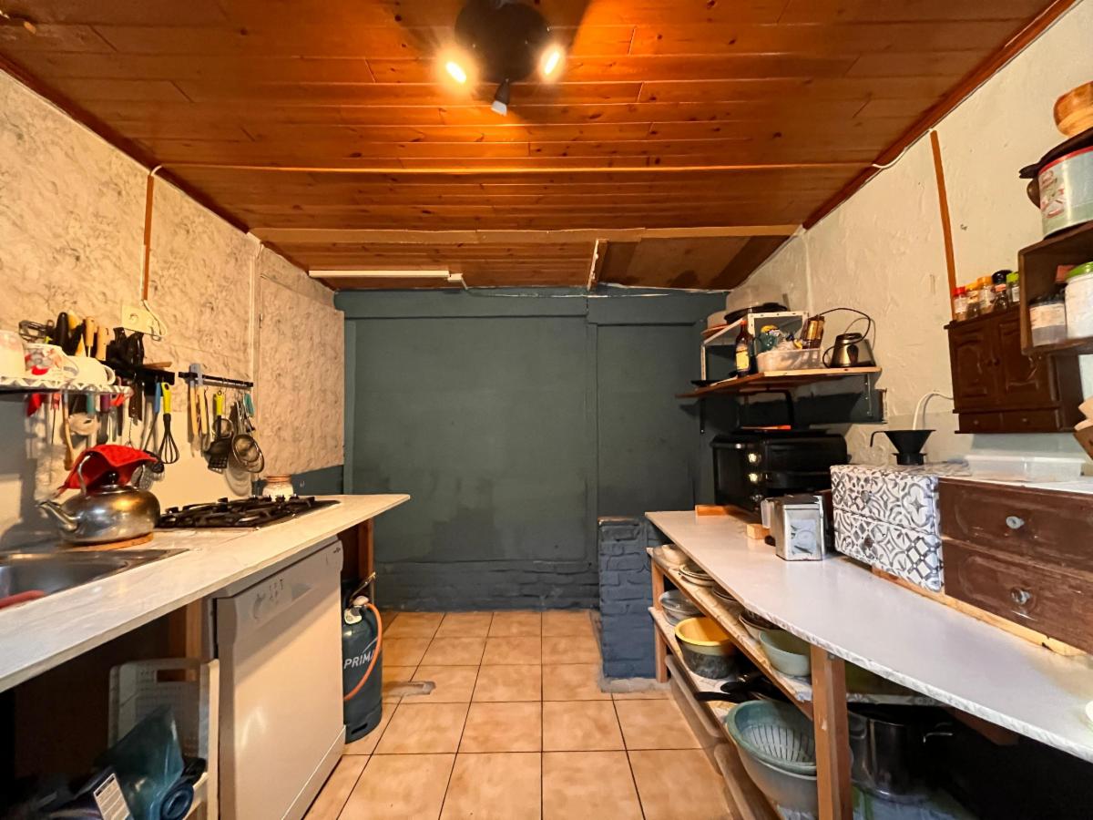 RDC: hall d'entrée, débarras, salle à manger et salon, cuisine avec accès à l'extérieur, garde-manger, salle de bains (lavabo, douche et WC) et buanderie