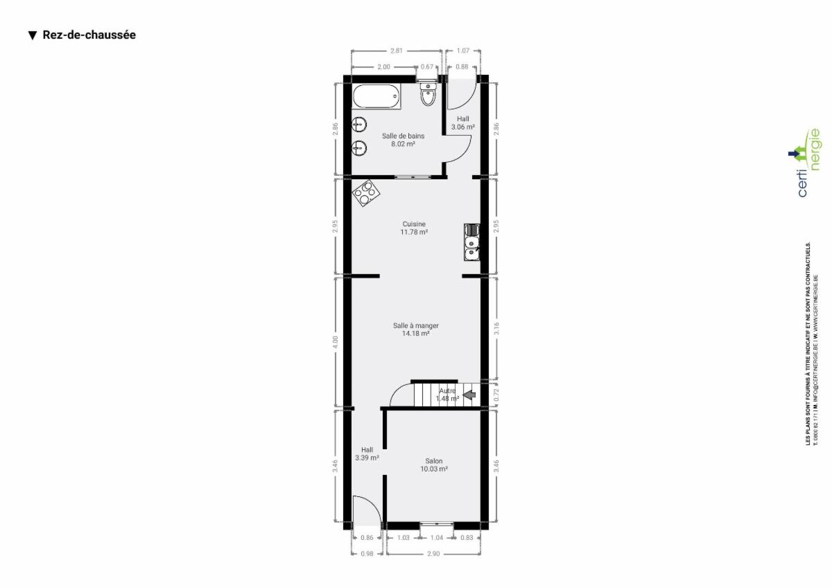 Au rez : Hall d’entrée (3,39m²), salon (10,03m²), salle à manger (14,18m²), cuisine semi-équipée (11,78m²), salle de bain (8,02m²).