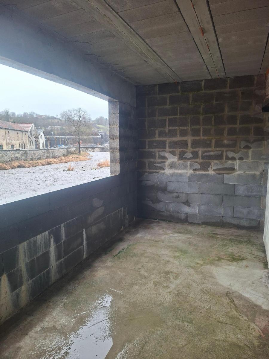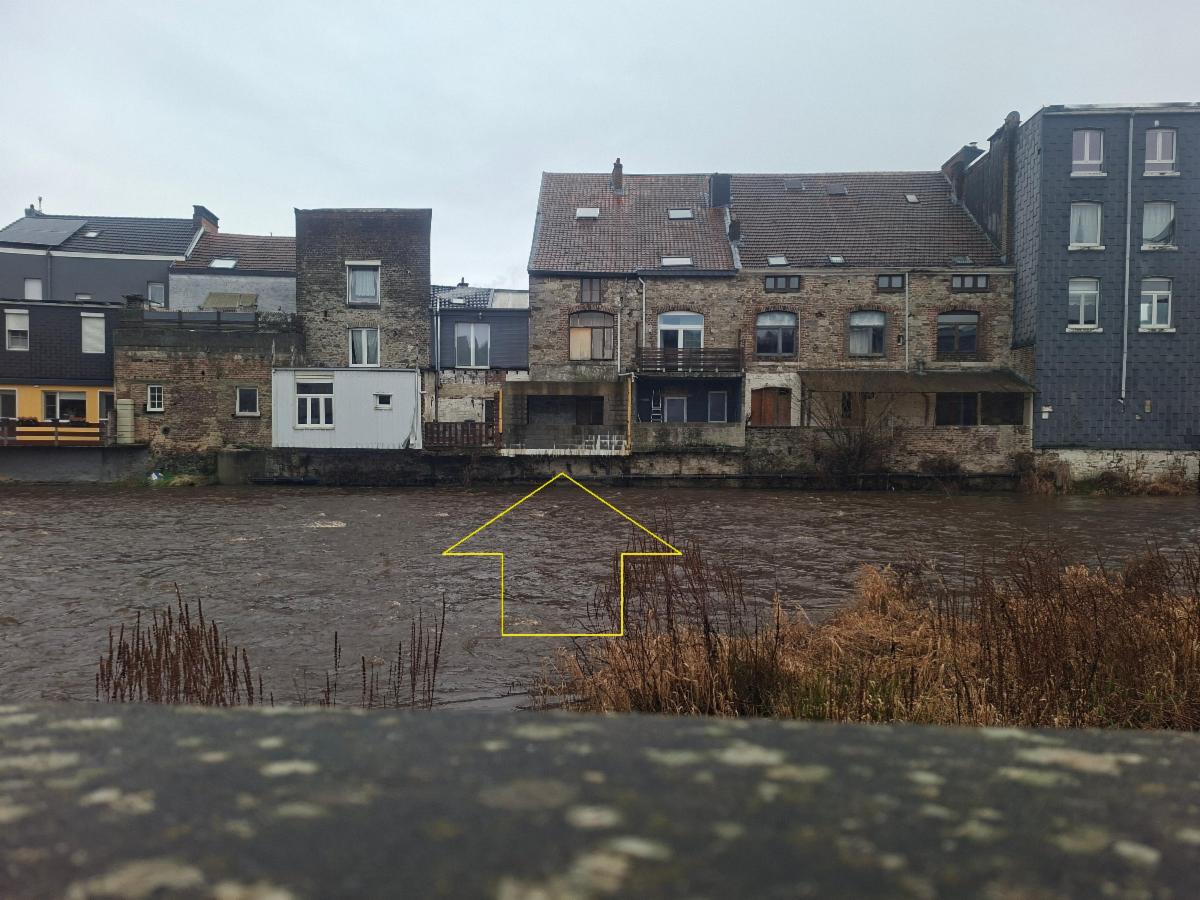 Le bien a été sinistré lors des inondations de 2021. Des travaux ont été entamés par le propriétaire, notamment la réalisation d’un mur anti-inondation, la pose d’une chape en béton armé au rez-de-chaussée ainsi que l’installation d’un clapet anti-retour sur le réseau d’évacuation. À l’arrière, la maison profite d’une vue dégagée sur le cours d’eau. Le mur anti-inondation, réalisé lors des travaux, crée un encadrement architectural qui met le paysage en valeur, à la manière d’un tableau.