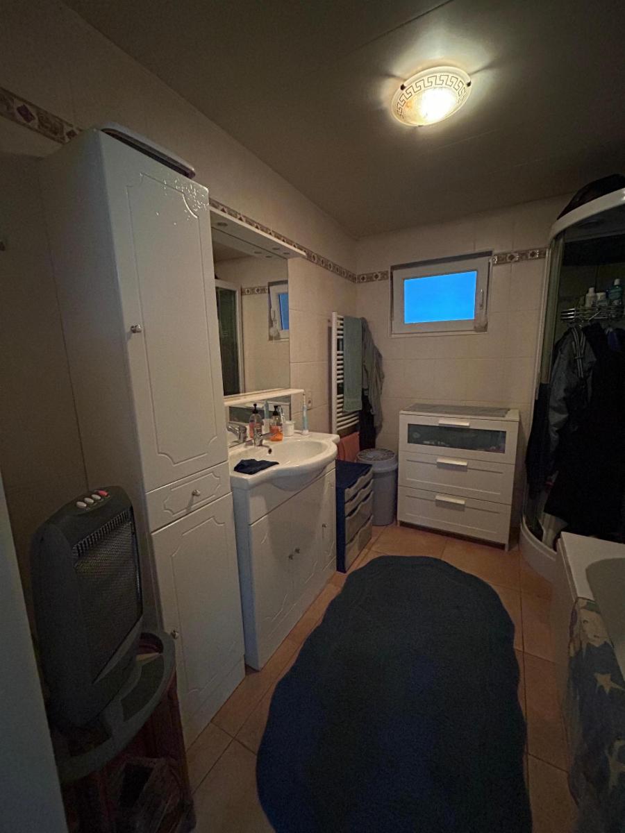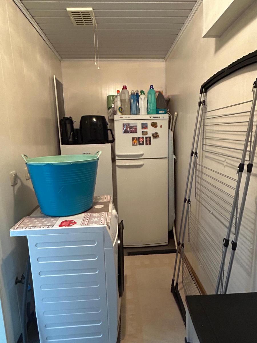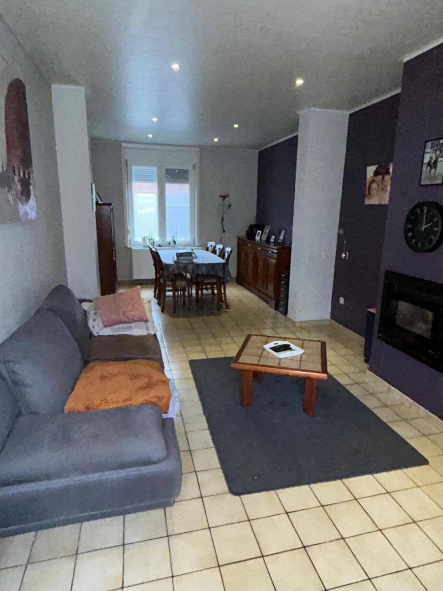 Le bien est composé au rez d'un hall qui donne vers une cuisine équipée (four, frigo, taque vitre, hotte, lave-vaisselle, évier), buanderie avec wc broyeur, salon, salle-ma-manger avec cassette au pellet, une salle-de-bain avec douche (non fonctionnelle car le panneau est fissuré), meuble évier, garage. Il y a un couloir qui mène au garage et au jardin.