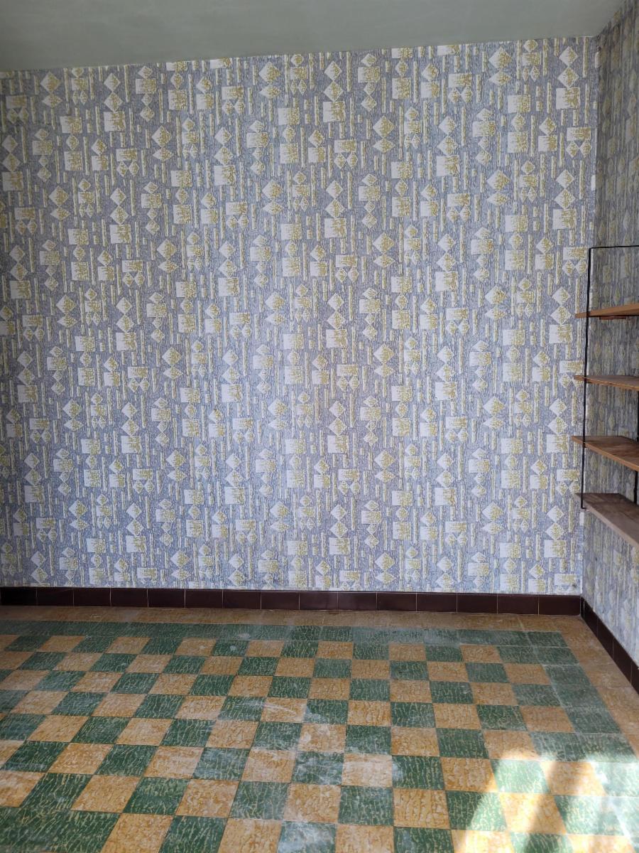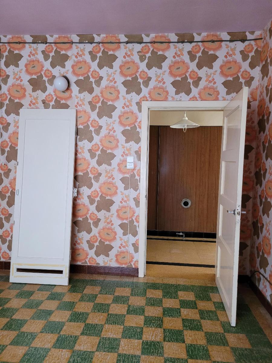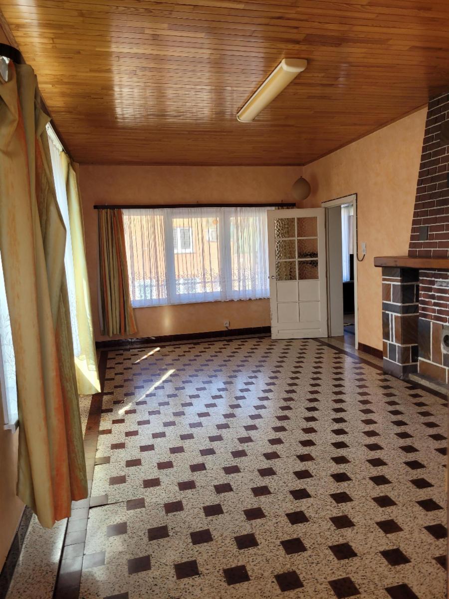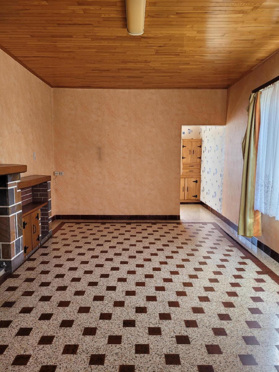 A droite, un living donnant accès à l'arrière à une cuisine non équipée et une salle de douche avec un lavabo et un wc.