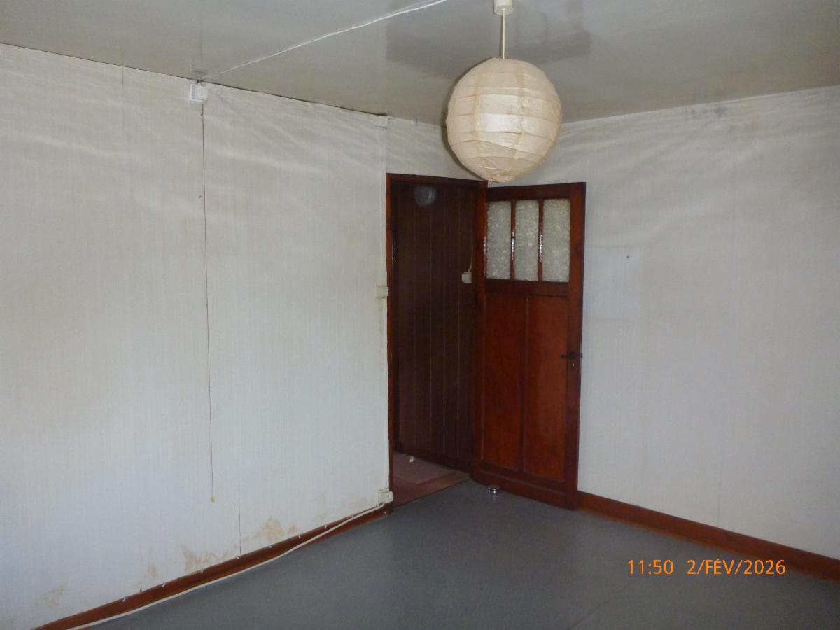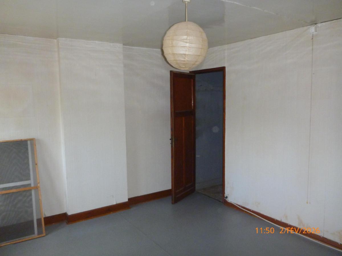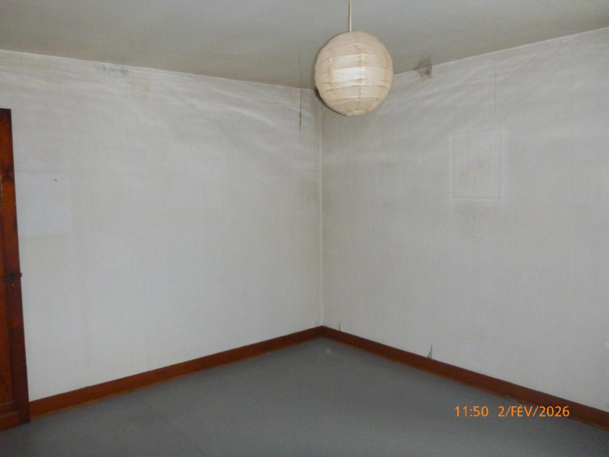 -Rez : un salon, une salle à manger, une salle de douche (WC, douche, évier) et une cuisine non-équipée.
