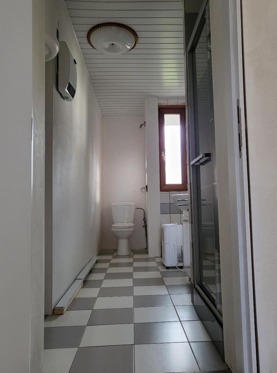 -Au rez-de-chaussée : petit sas d'entrée, salon/salle à manger, salle de douche avec WC, coin cuisine;