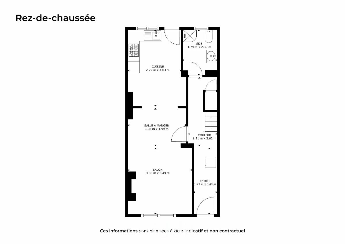 Au rez-de-chaussée : Un hall d'entrée, un spacieux séjour ouvert sur une cuisine équipée avec accès aux extérieurs ainsi qu'une salle de douche.