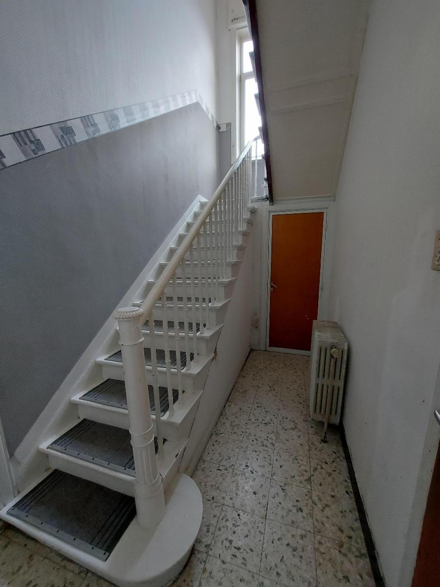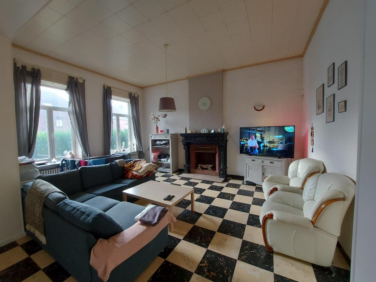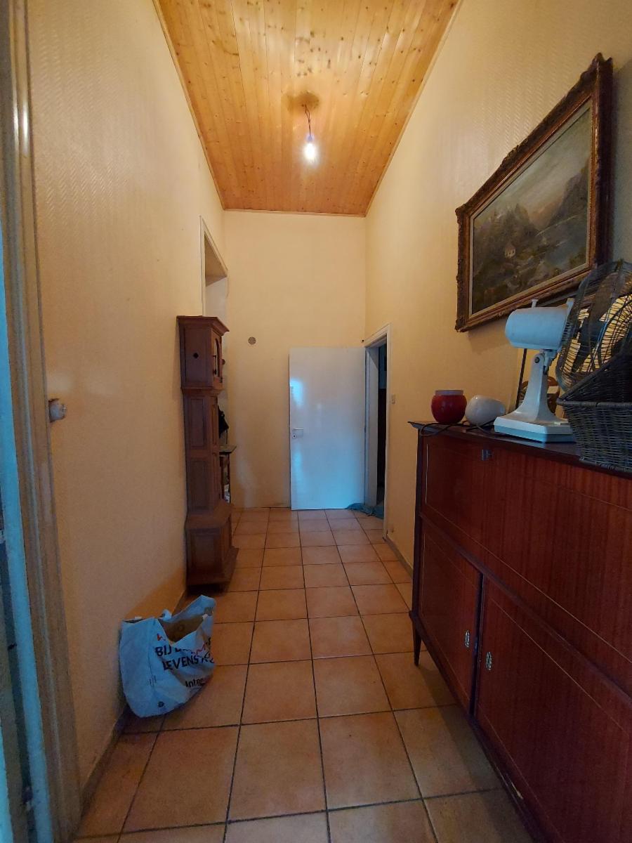 Composition : S-sol : cave. R-de-ch : hall lumineux (lambris – granito au sol) donnant sur un living spacieux (± 40 m²) – cuisine non équipée sur la droite donnant sur un hall central (escalier vers l’étage) avec WC (non utilisable) – second hall vers buanderie (± 20m²) et accès cave (humide) – second living spacieux – salle de bains (douche – wc – lavabo) – annexes (mauvais état – toiture à réparer) avec accès extérieur (avant et arrière).