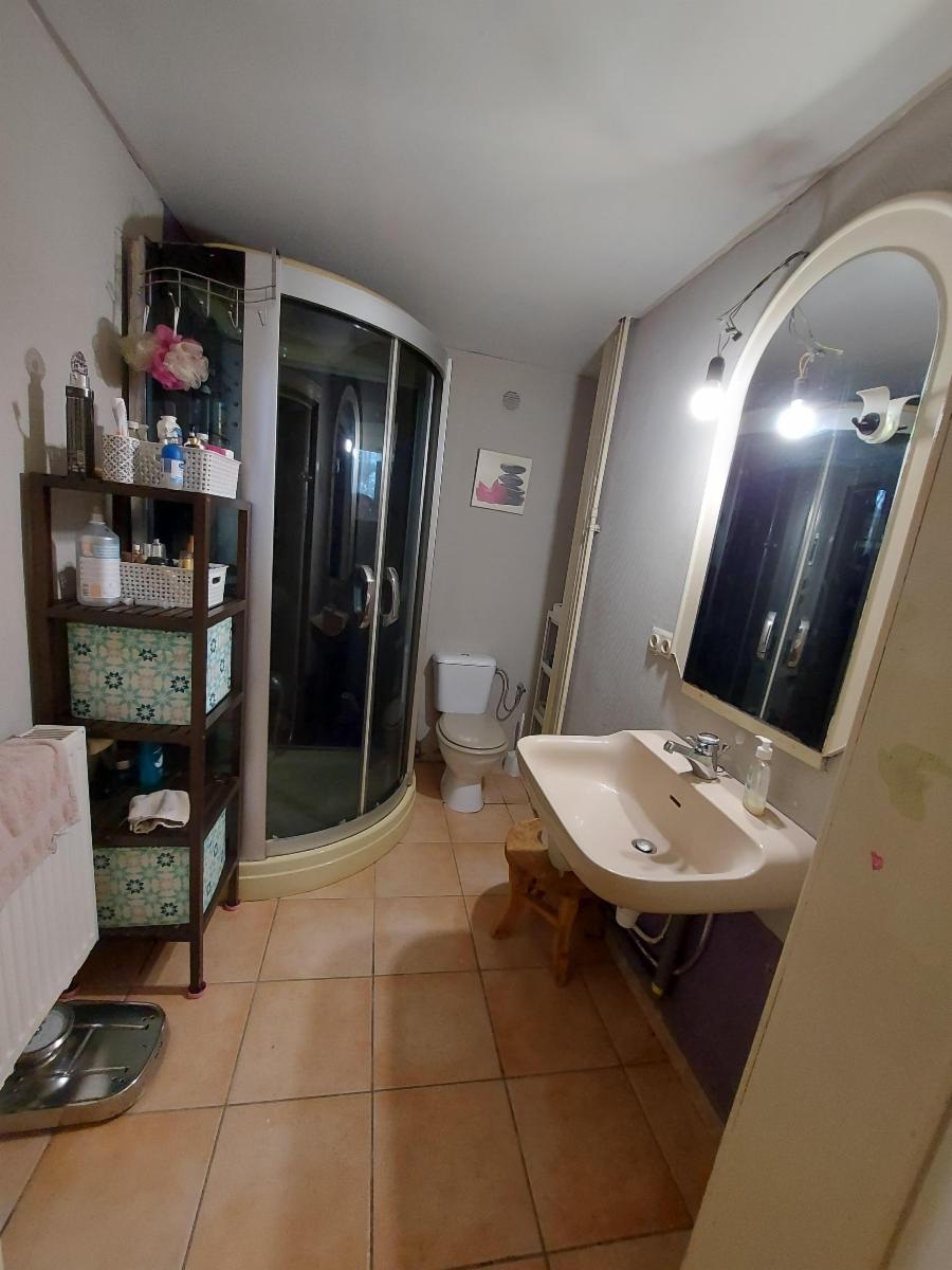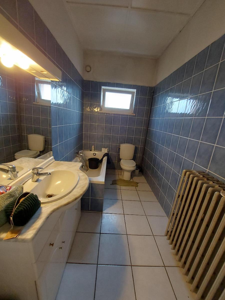 Etage : grand hall de nuit desservant 5 chambres – salle de douche (humide, non utilisable) – grenier aménageable – salle de bains (carrelée – baignoire – lavabo)