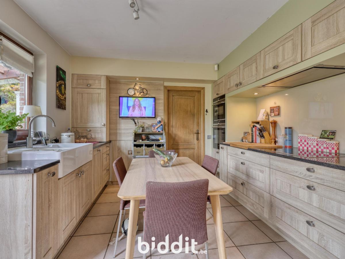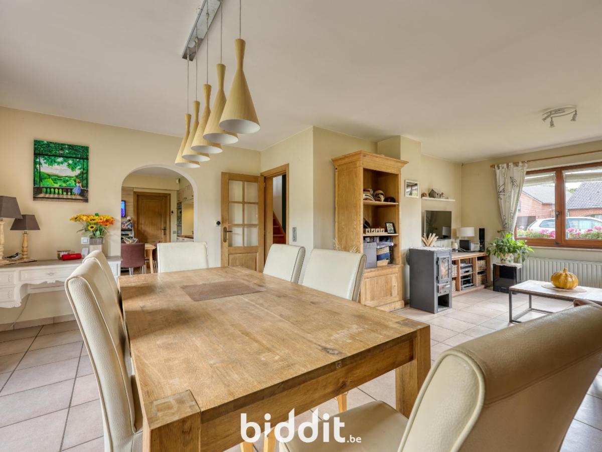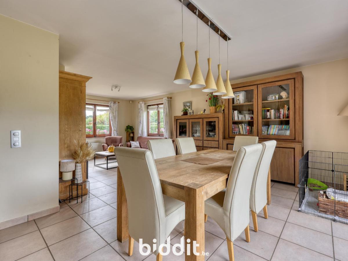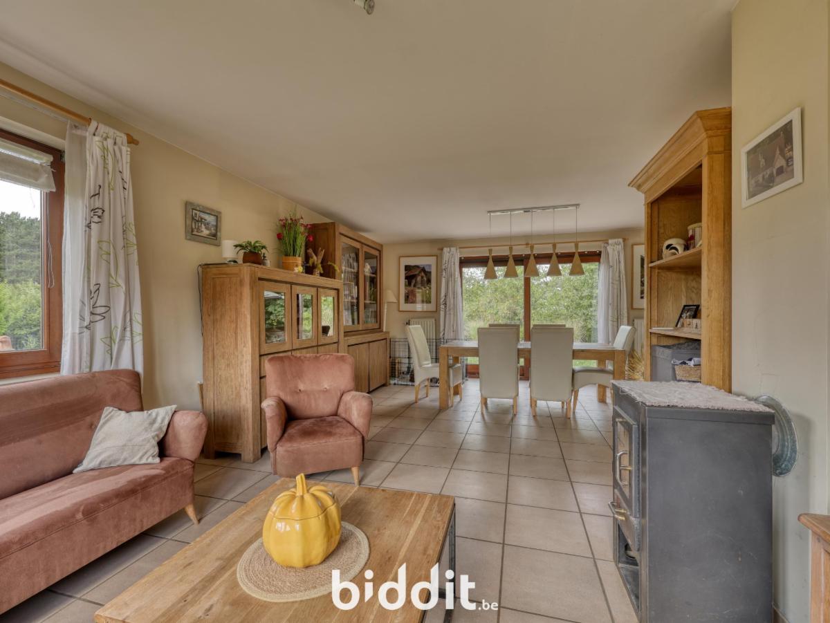 Rez-de-chaussée : hall d’entrée, WC avec lave-mains, salle de bains (bain + douche), vaste living traversant en L avec poêle à bois et accès à la grande terrasse couverte, cuisine équipée Siemens avec sortie vers le jardin, buanderie avec placards, garage motorisé + carport.