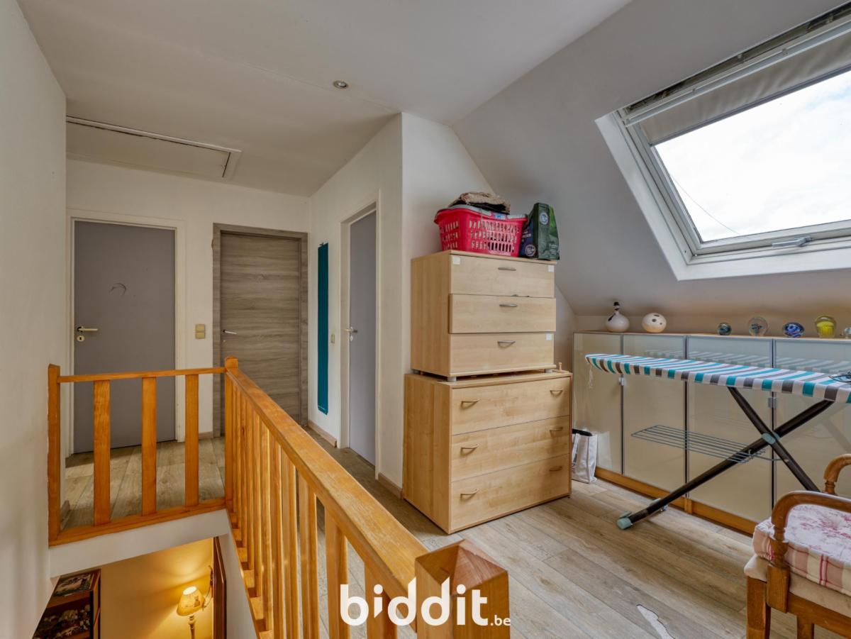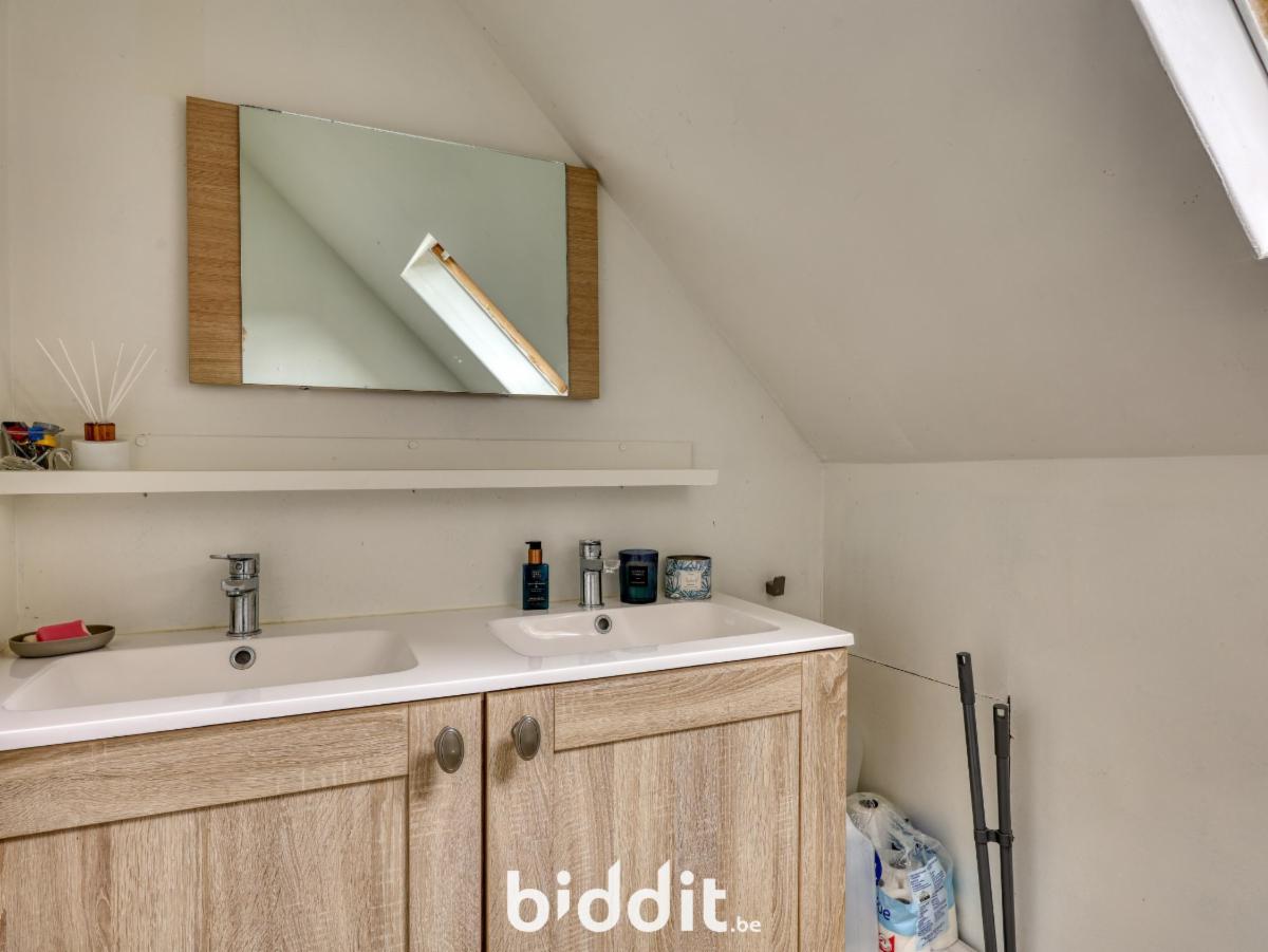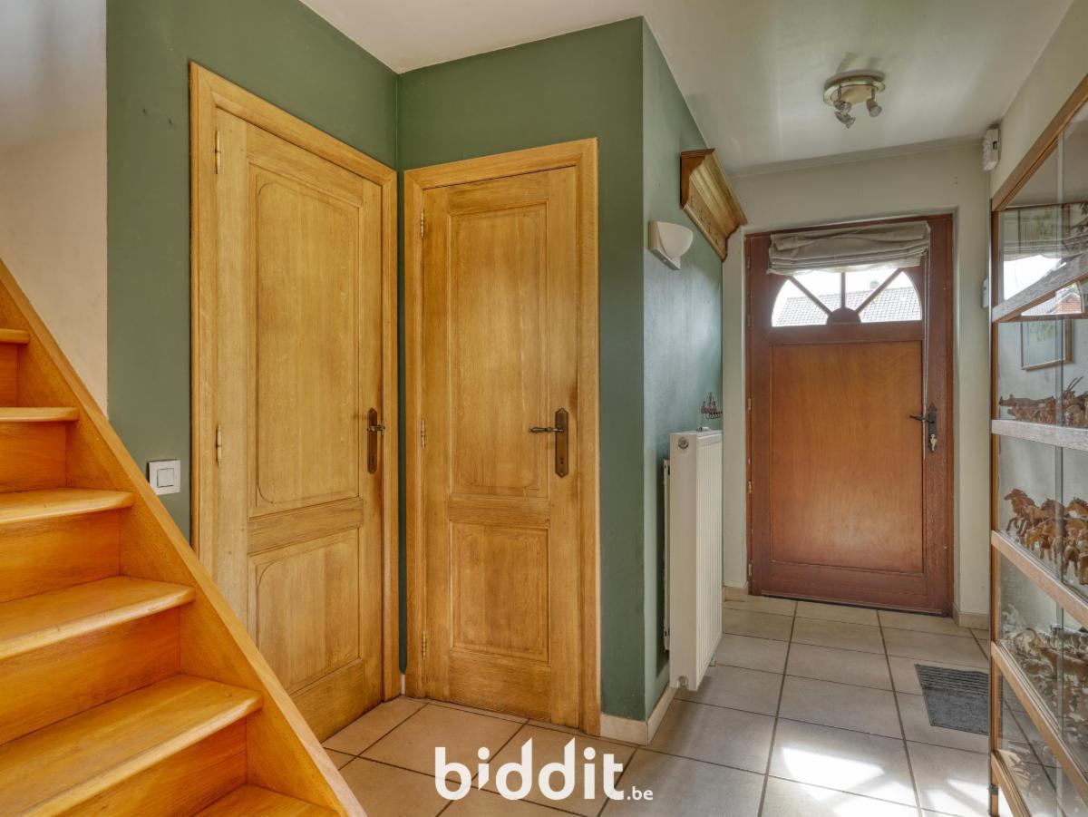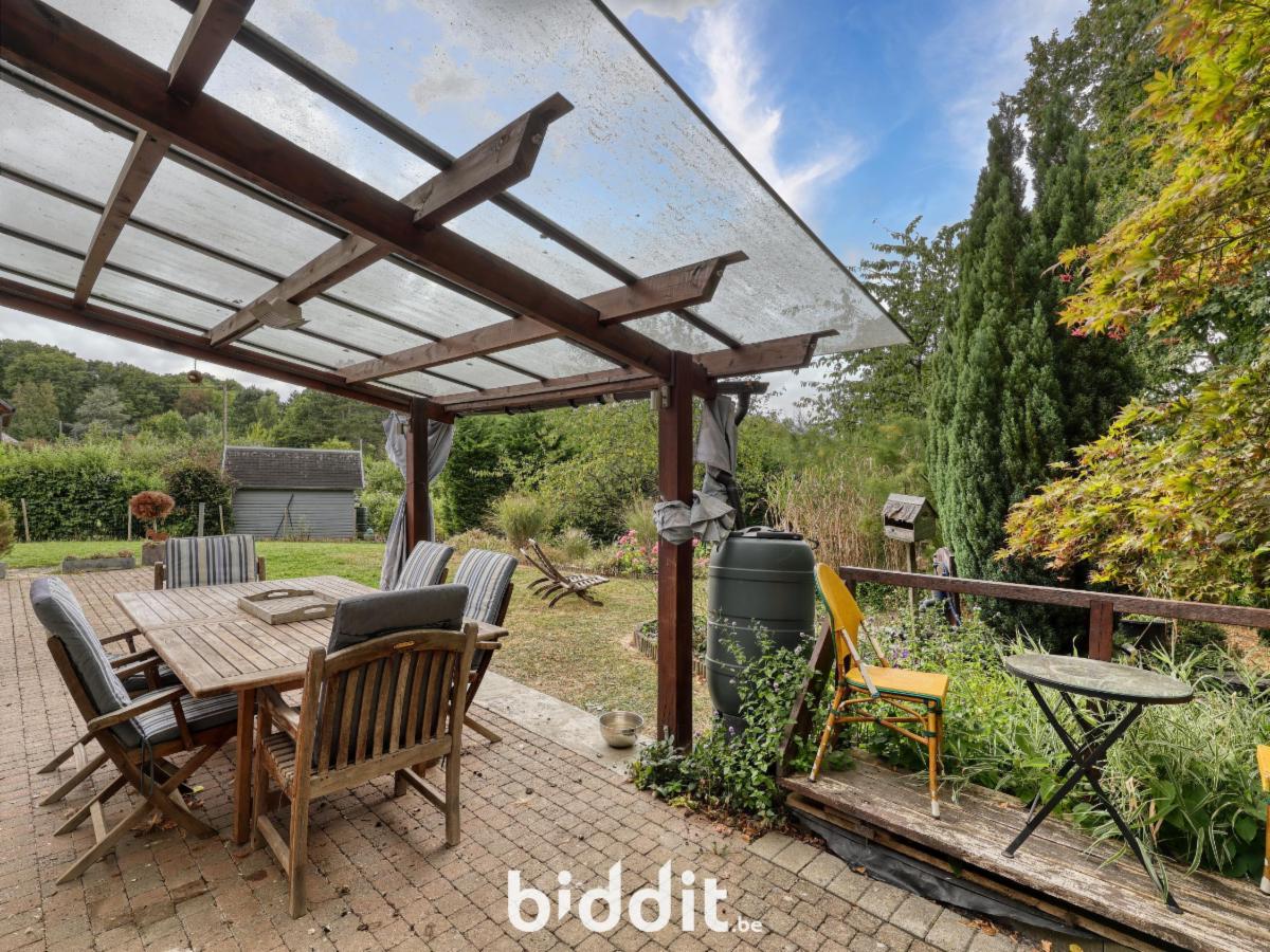 Rez-de-chaussée : hall d’entrée, WC avec lave-mains, salle de bains (bain + douche), vaste living traversant en L avec poêle à bois et accès à la grande terrasse couverte, cuisine équipée Siemens avec sortie vers le jardin, buanderie avec placards, garage motorisé + carport.