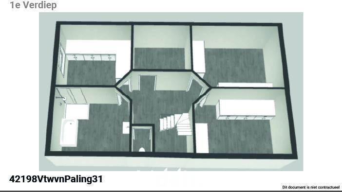 Indeling eerste verdieping: hal, badkamer, twee slaapkamers, bergruimte en bureel.