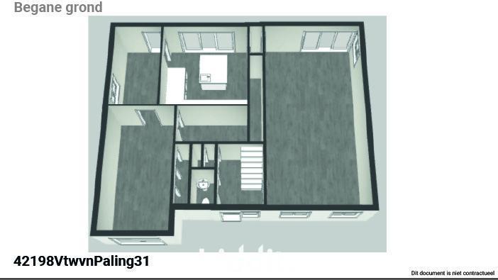 Indeling gelijkvloers: inkom, woonkamer, keuken met berging en garage.