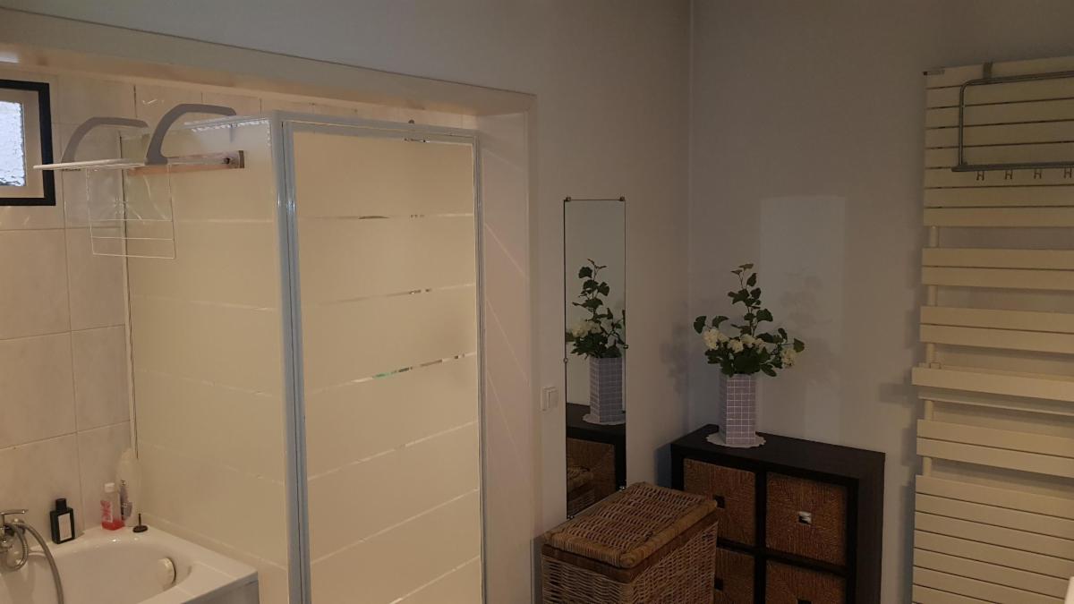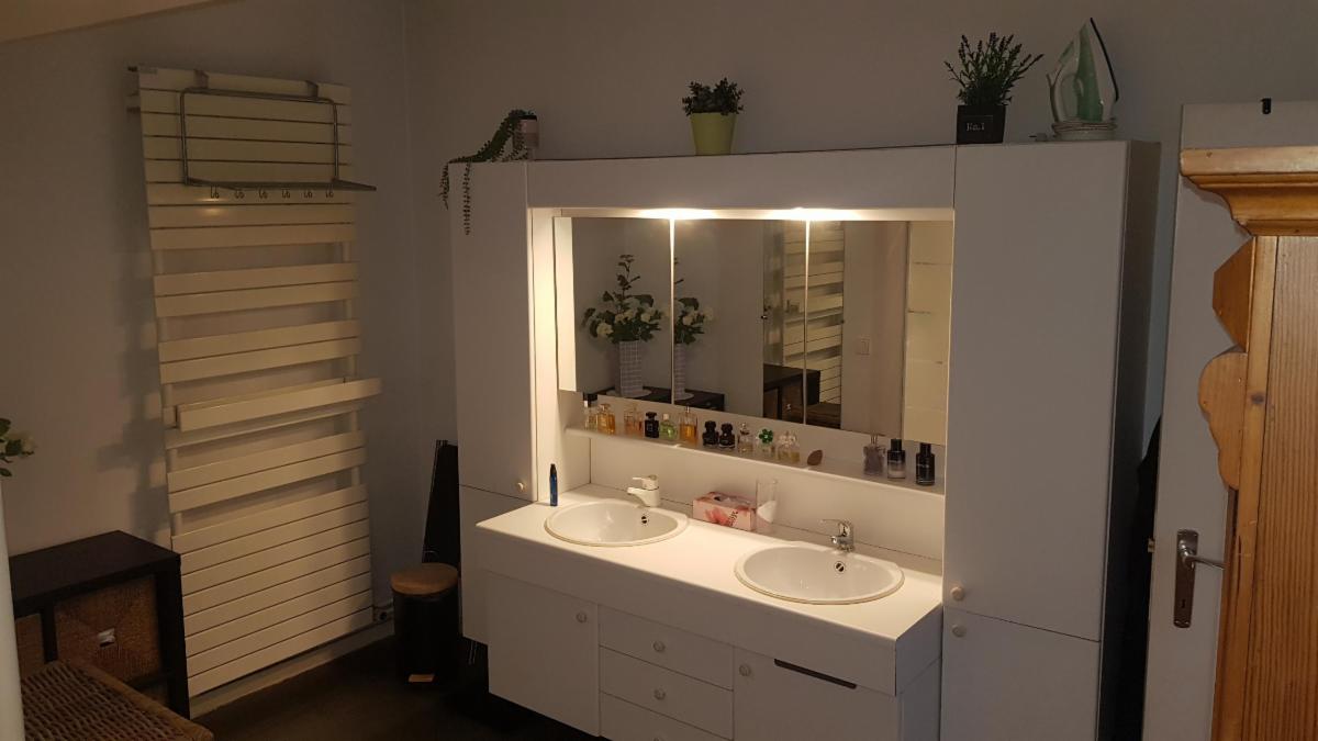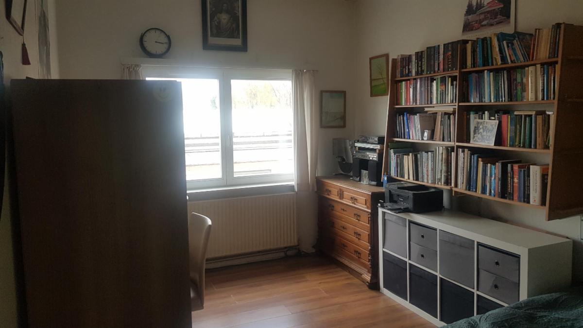 De keuken, in tijdloos wit, is voorzien van een kookplaat (elektro) en oven, alsook vaatwasmachine. Er is ook nog een kast voorzien waar u eventueel een inbouwkoelkast kunt plaatsen. De radiator is nieuw alsook het valse plafond in houten planchetten. Het schuifraam en kleinere raam hebben beiden een elektrische zonnewering. Via een deur is er ook toegang tot de kelder waar zich een hoogrendementsketel op gas bevindt. (geïnstalleerd in 2022).