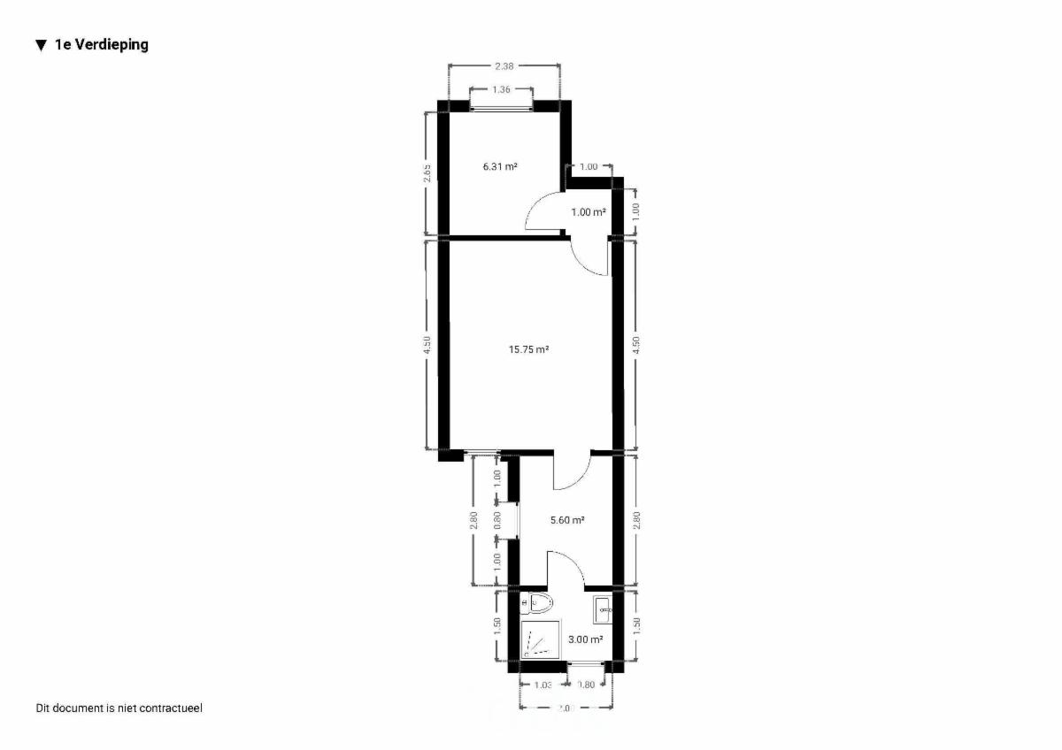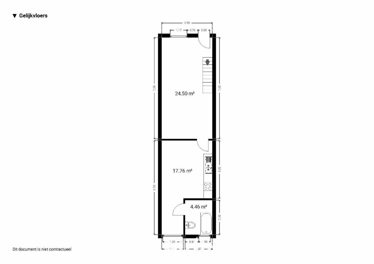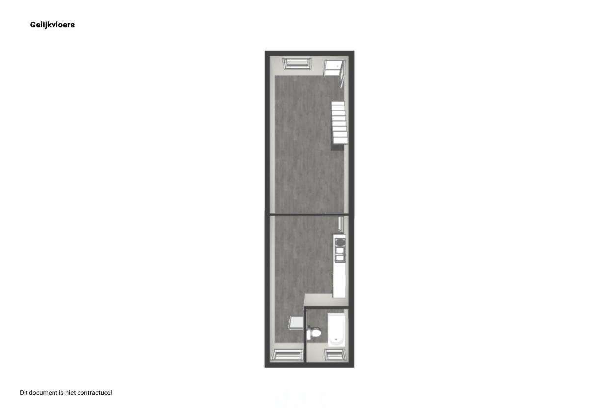 - gelijkvloers: leefruimte, keuken met eetplaats, badkamer met bad en toilet, tuin met berging;