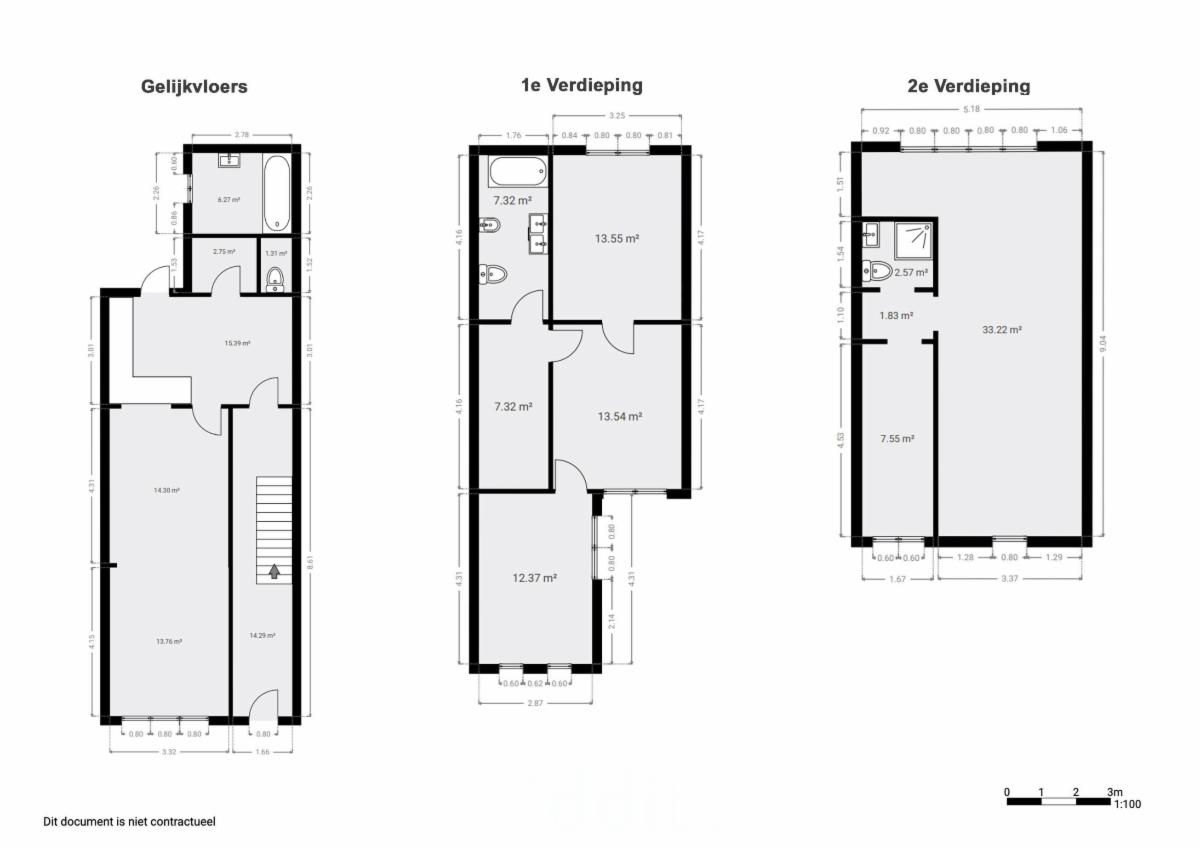 1ste verdieping: 3 slaapkamers, 1 badkamer en toilet.