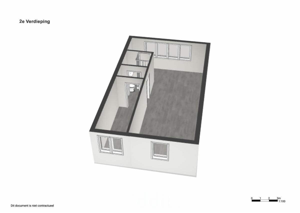 2de verdieping: grote ruimte met veel potentiële mogelijkheden, een douchekamer, toilet.