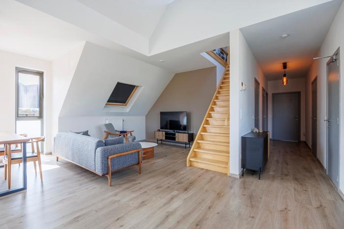 Het appartement beschikt over 2 volwaardige slaapkamers en een extra open ruimte op de bovenverdieping, ideaal als bureau, leeshoek of berging. Dankzij de open vide heb je een stijlvolle doorkijk naar de leefruimte beneden, wat zorgt voor een uniek en ruimtelijk karakter. Het appartement heeft een zeer ruim terras waar je kunt genieten van prachtige uitzichten en veel natuurlijke lichtinval.