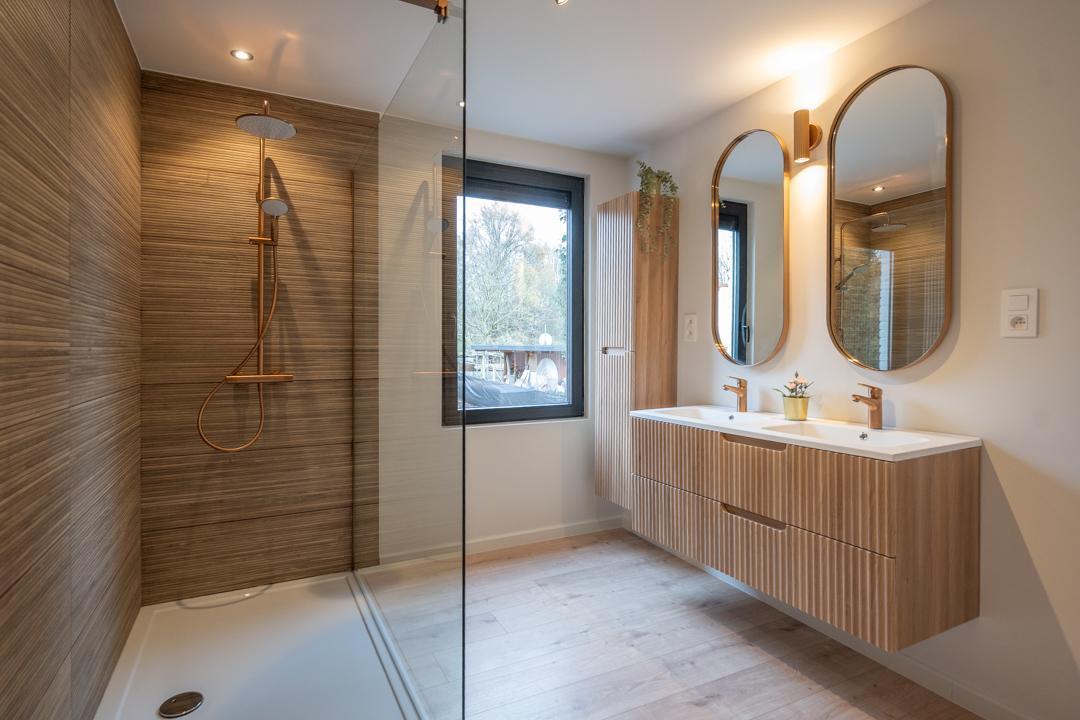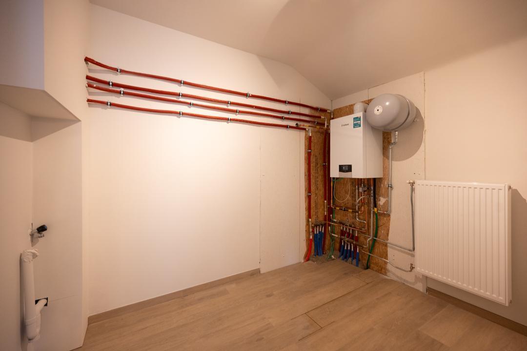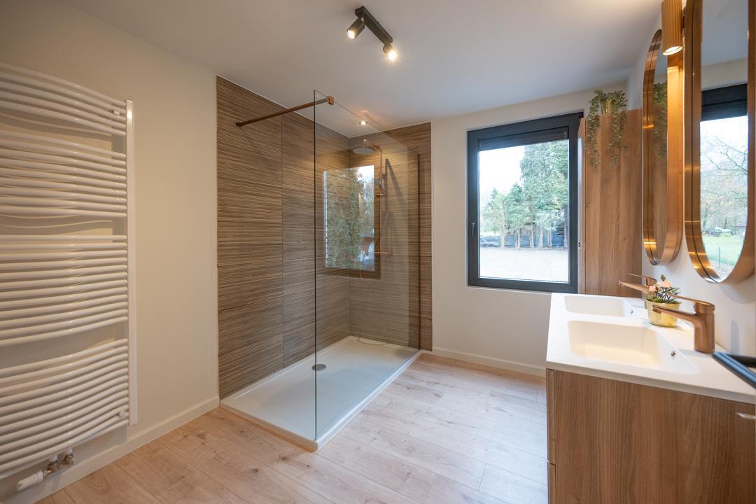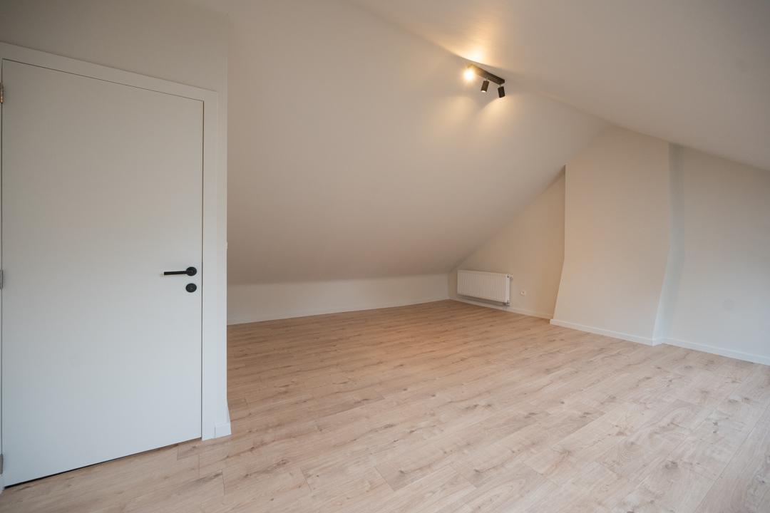 Op de eerste verdieping met ruime nachthal zijn er 2 ruime slaapkamers en een badkamer met inloopdouche, dubbele lavabo en toilet. Er is een extra ruimte die kan dienen als slaapkamer, dressing of bureau. De eerste verdieping is voorzien van laminaat.