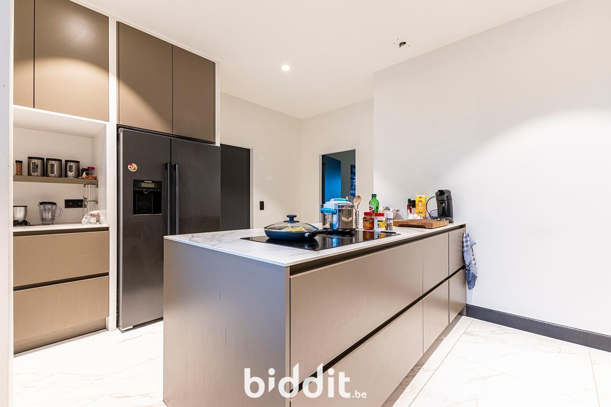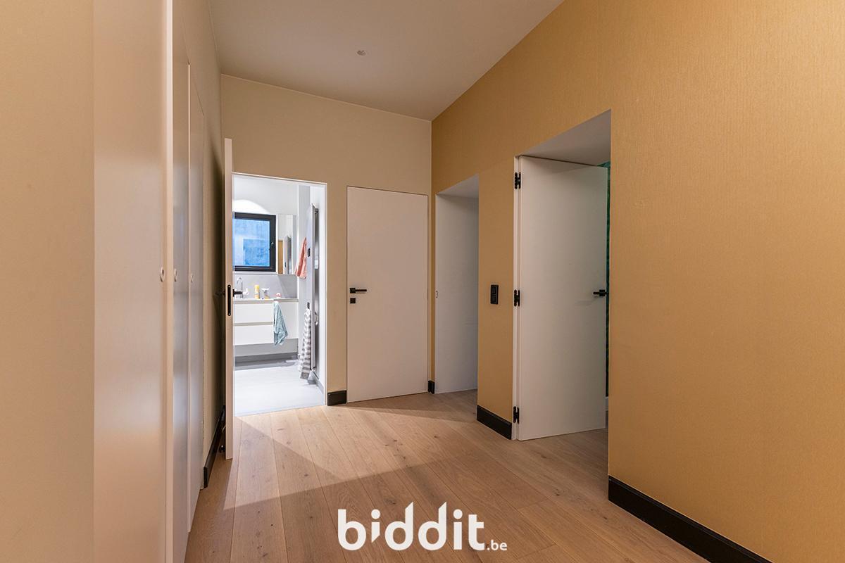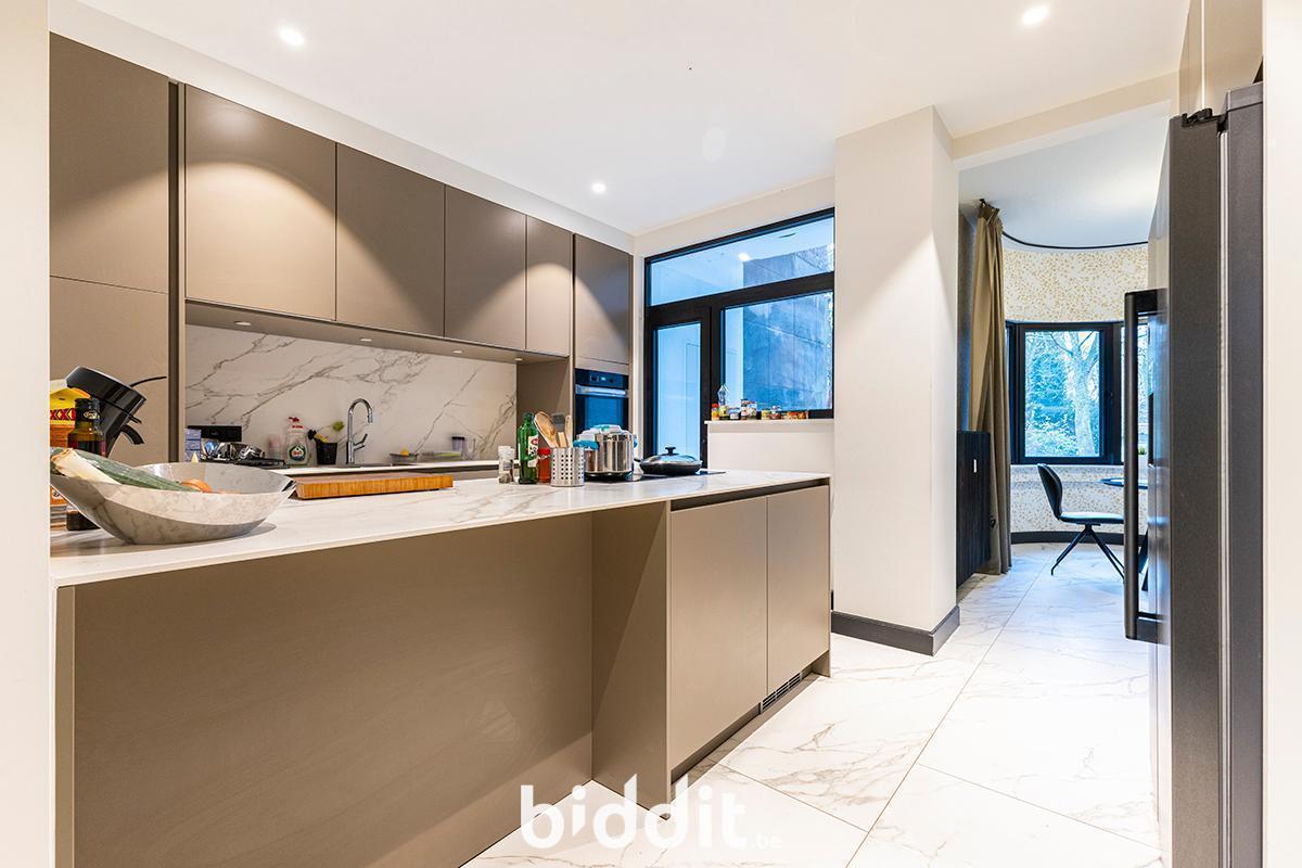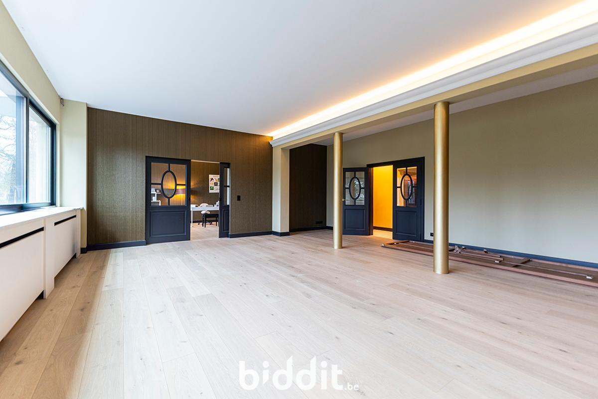 Het appartement beschikt over een royale leefruimte met prachtig eiken parket, een apart bureel, en een volledig ingerichte keuken met aansluitend terras. Verder zijn er vier volwaardige slaapkamers, twee badkamers (waarvan één en-suite), en twee aparte toiletten. Een praktische berging voor was- en droogkast is eveneens voorzien.