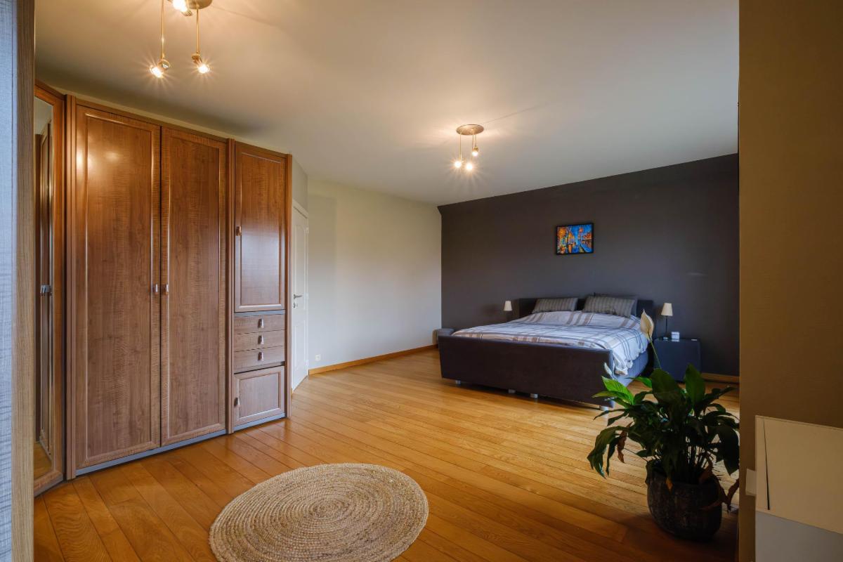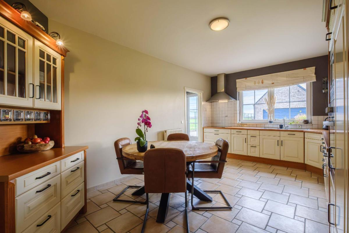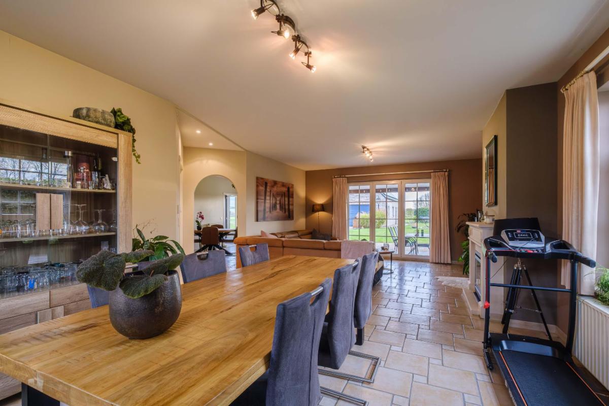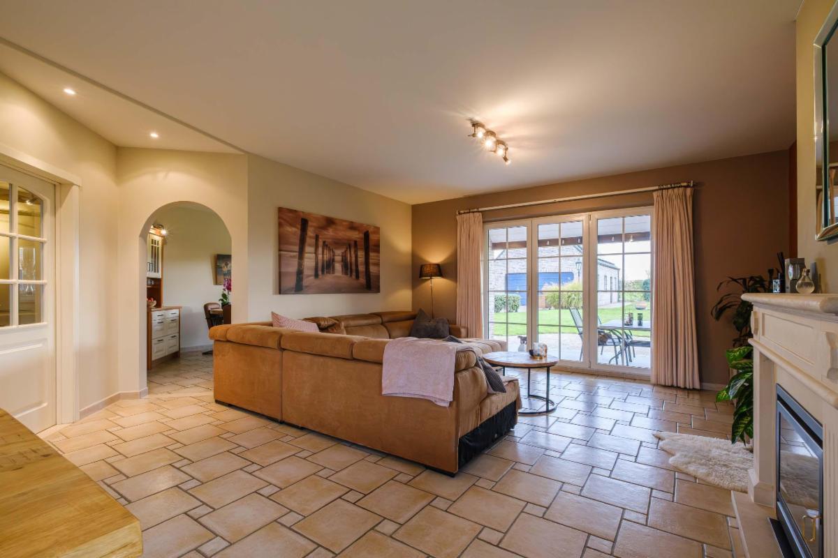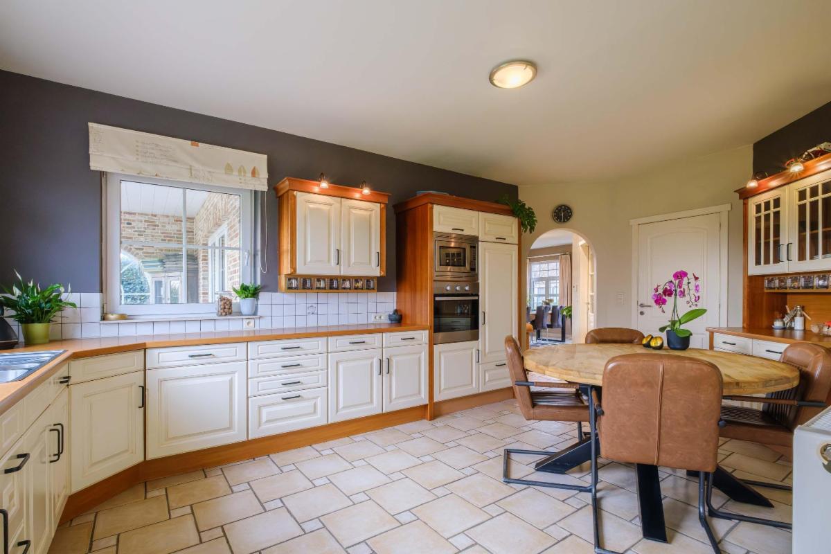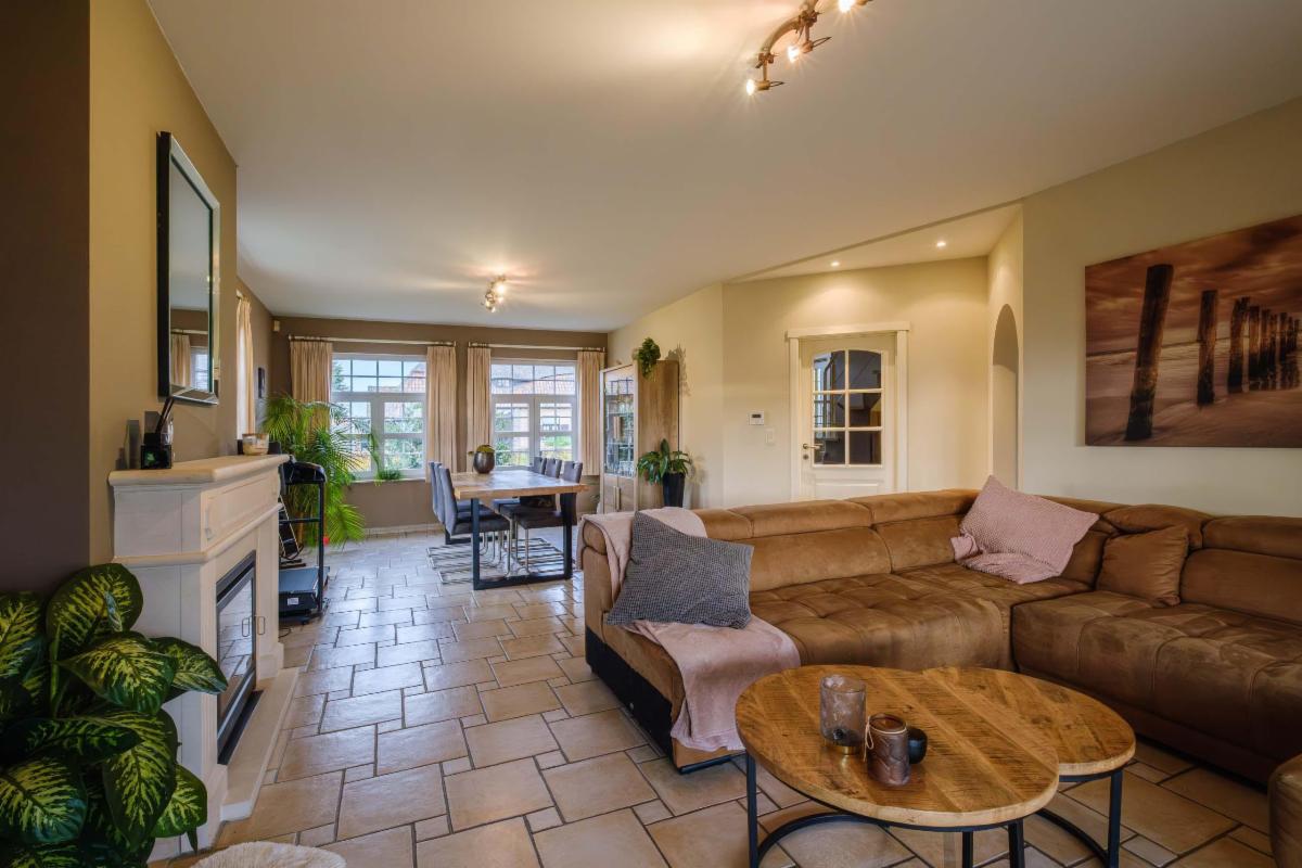 De lichtrijke woonkamer (ca. 40 m²) is uitgerust met een open haard. De volledig geïnstalleerde keuken biedt zicht op de tuin en het terras, en is tevens gemakkelijk toegankelijk via de achterinkom.