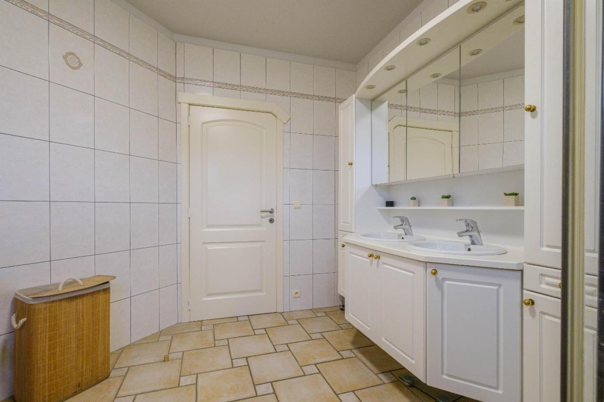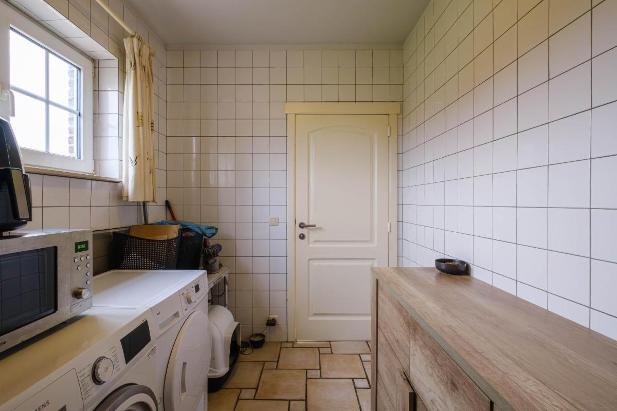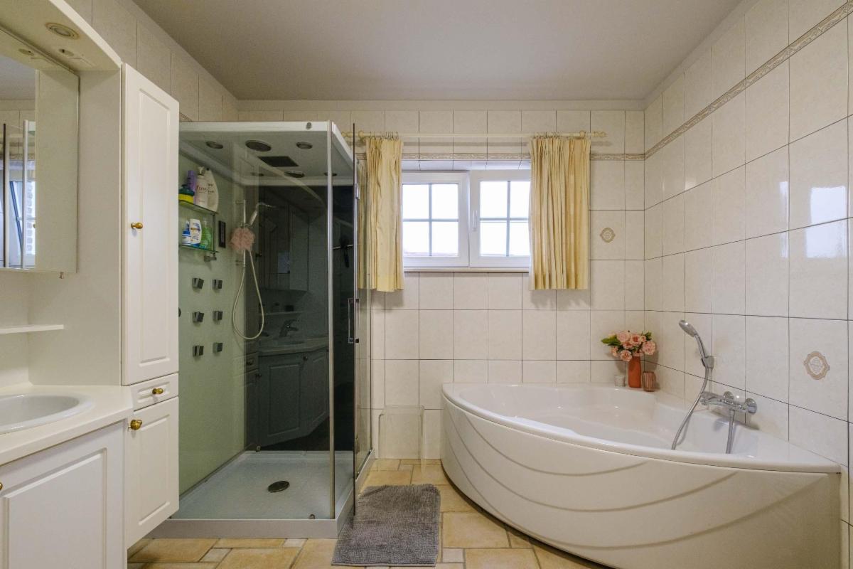 De badkamer is ingericht met een hoekligbad, douchecabine en een badkamermeubel met dubbele wastafel. Via de achterinkom zijn ook het aparte toilet en de wasplaats bereikbaar.