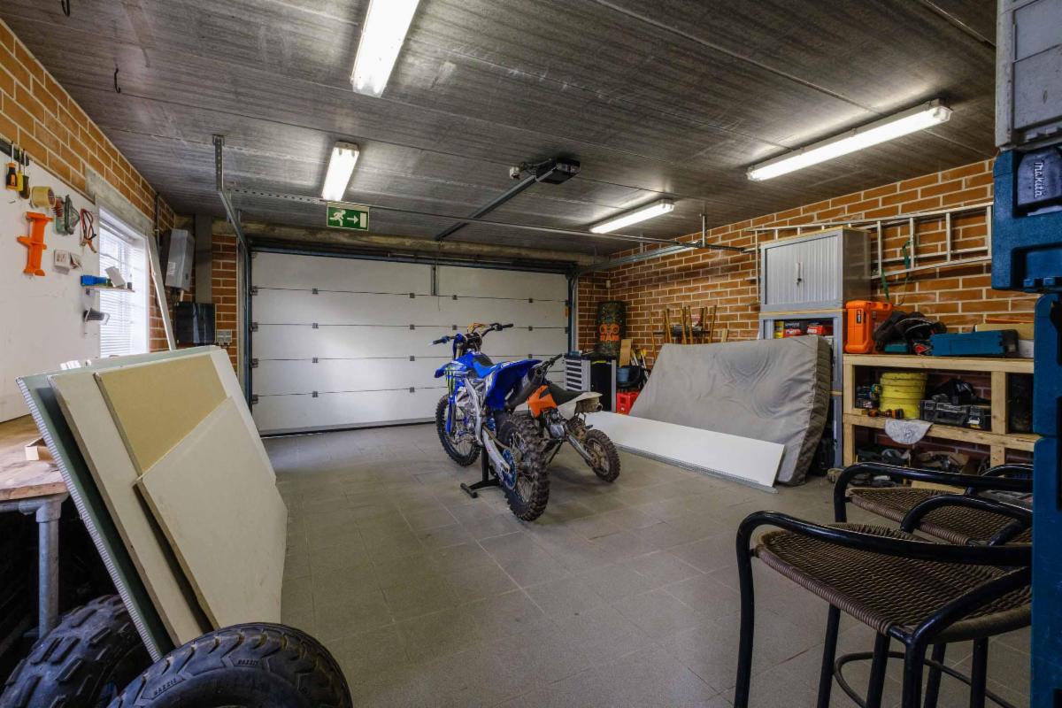 De garage beschikt over een dubbele automatische sectionale poort en is achteraan uitgerust met een sauna en douche.
