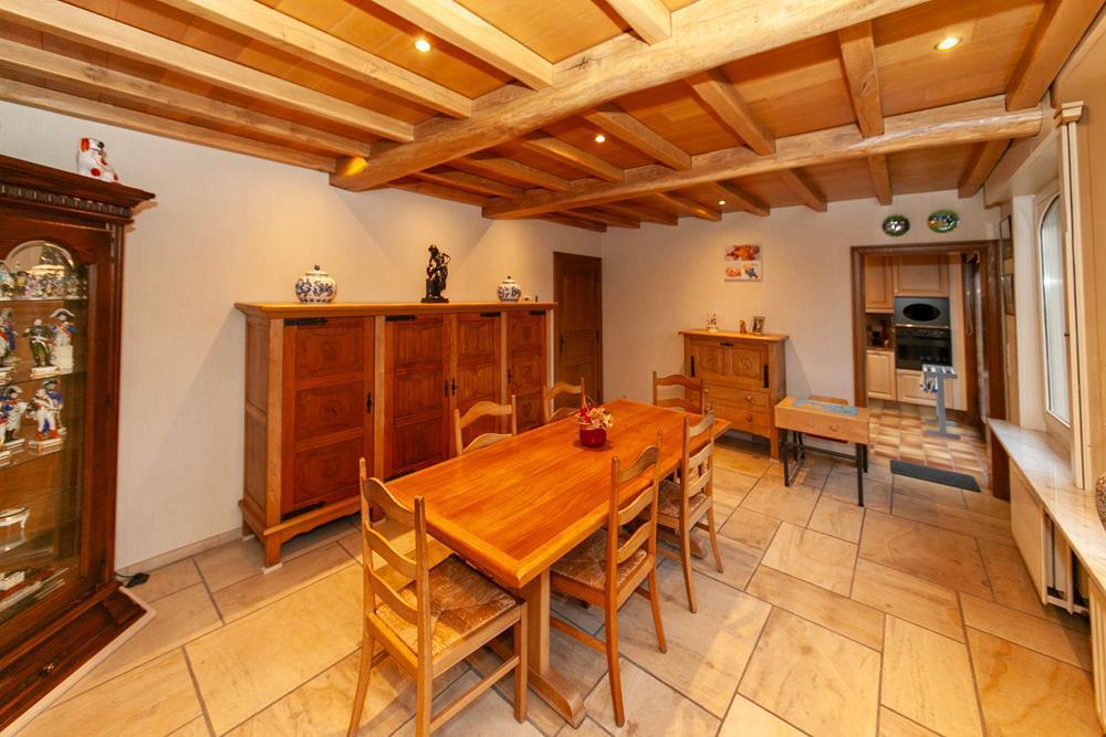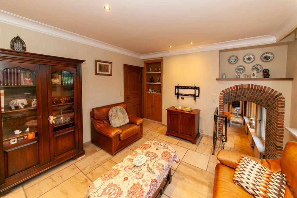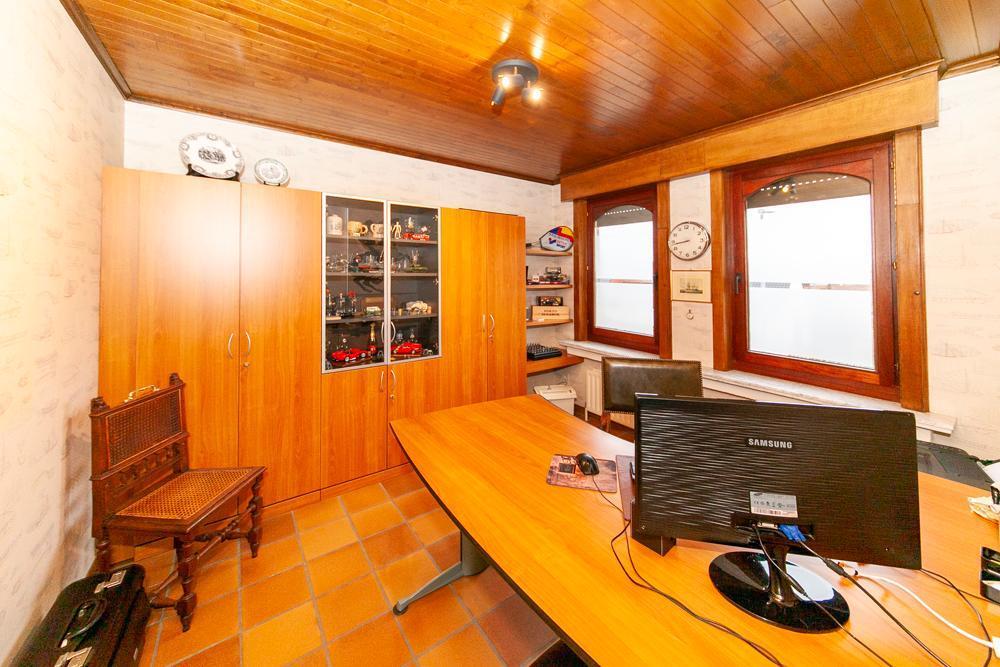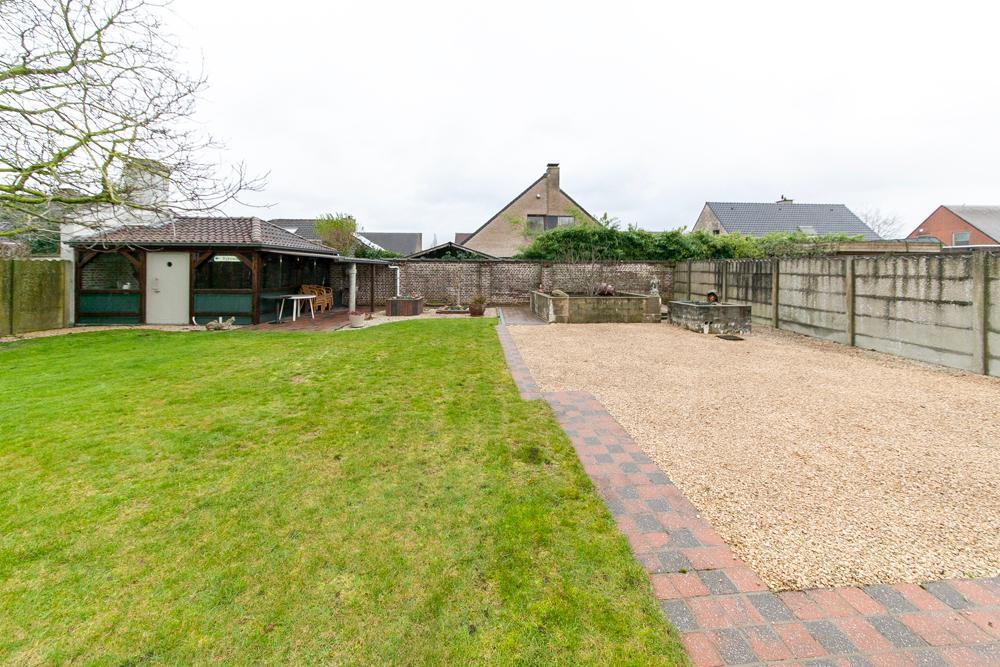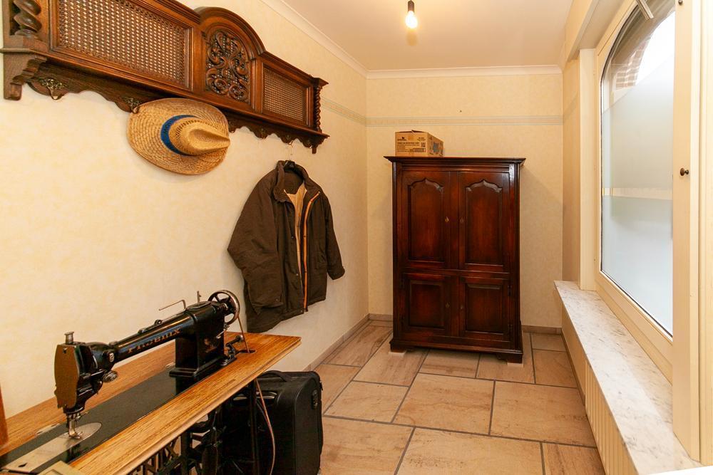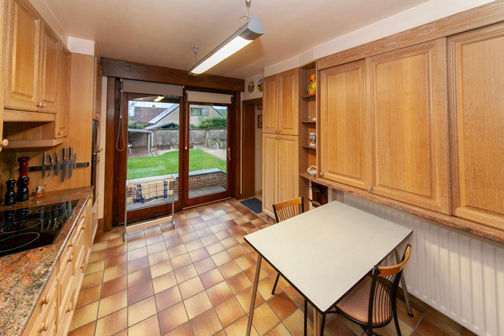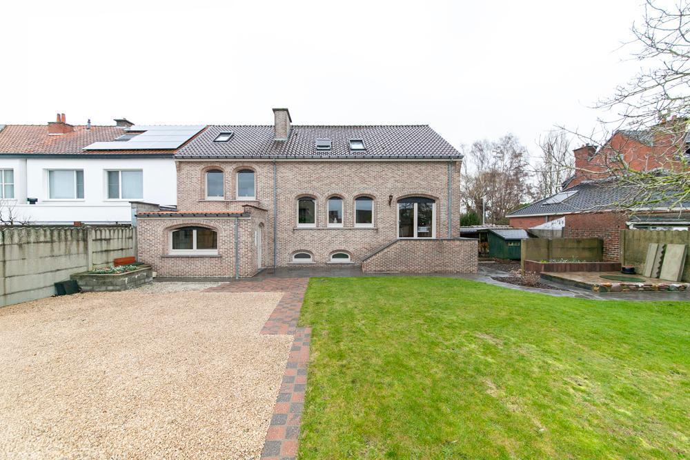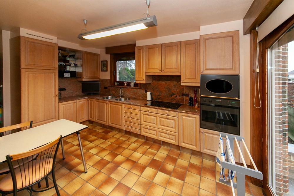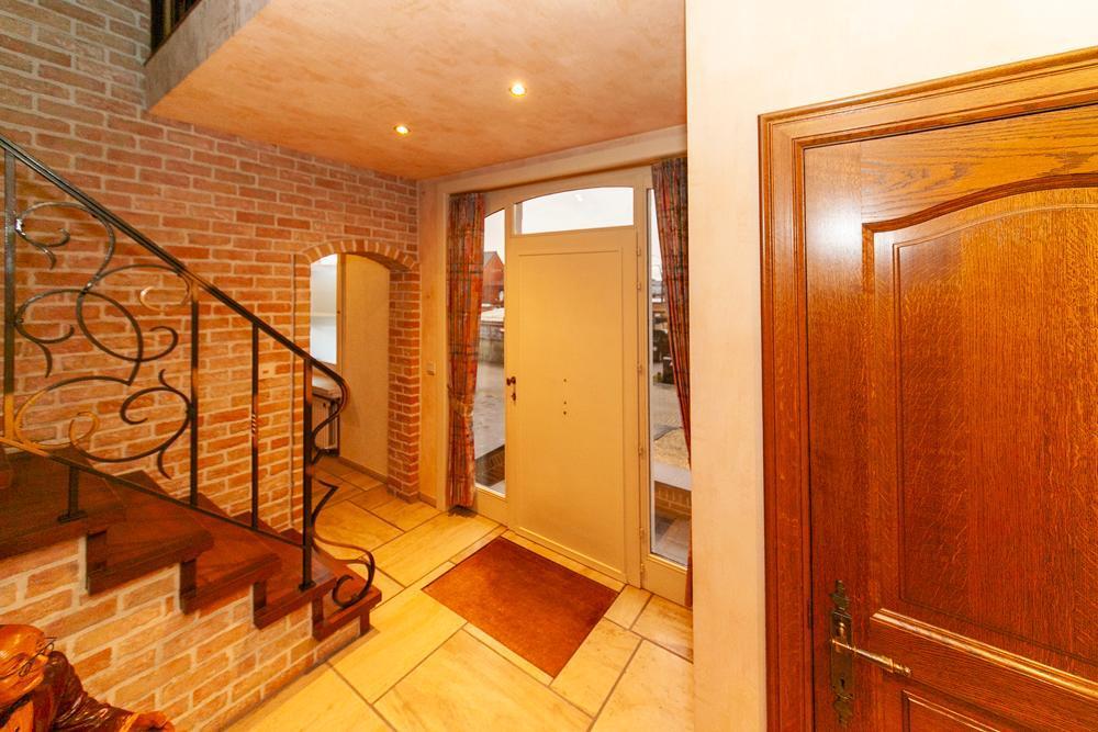 De woning is voorzien van een inkomhall met ruime vestiaire en een gastentoilet Zowel de keuken als de living zijn te bereiken via de eetkamer. De landelijke keuken is voorzien van veel bergruimte en is uitgerust met de nodige apparatuur. Op het eerste verdiep vinden we een bureau, die tevens bereikbaar is via de living. De woning beschikt over 3 ruime slaapkamers, één badkamer, uitgerust met douche en bad, en een aparte kamer met een toilet en lavabo. Vooraan de woning ligt een ruime oprit met garage. De ruime garage is voorzien van inbouwkasten. Achteraan de woning bevindt zich een uitgestrekte tuin met achteraan een tuinhuis. In het tuinhuis is een gezellig open haard aanwezig.