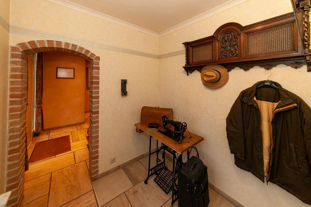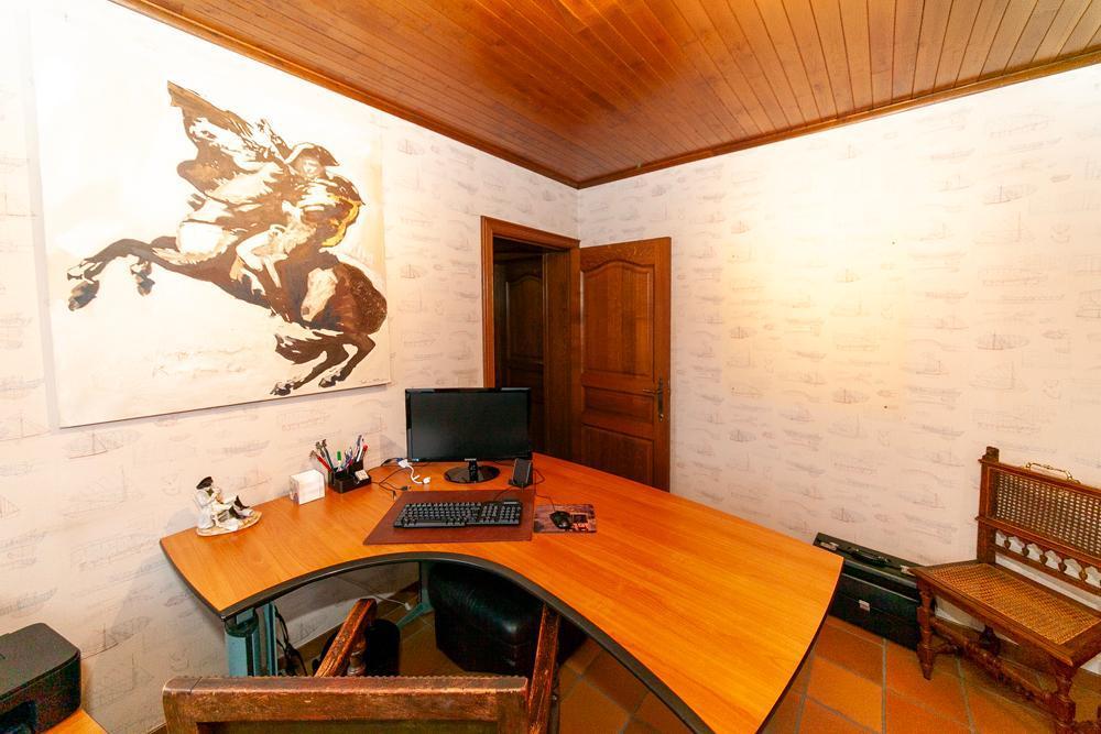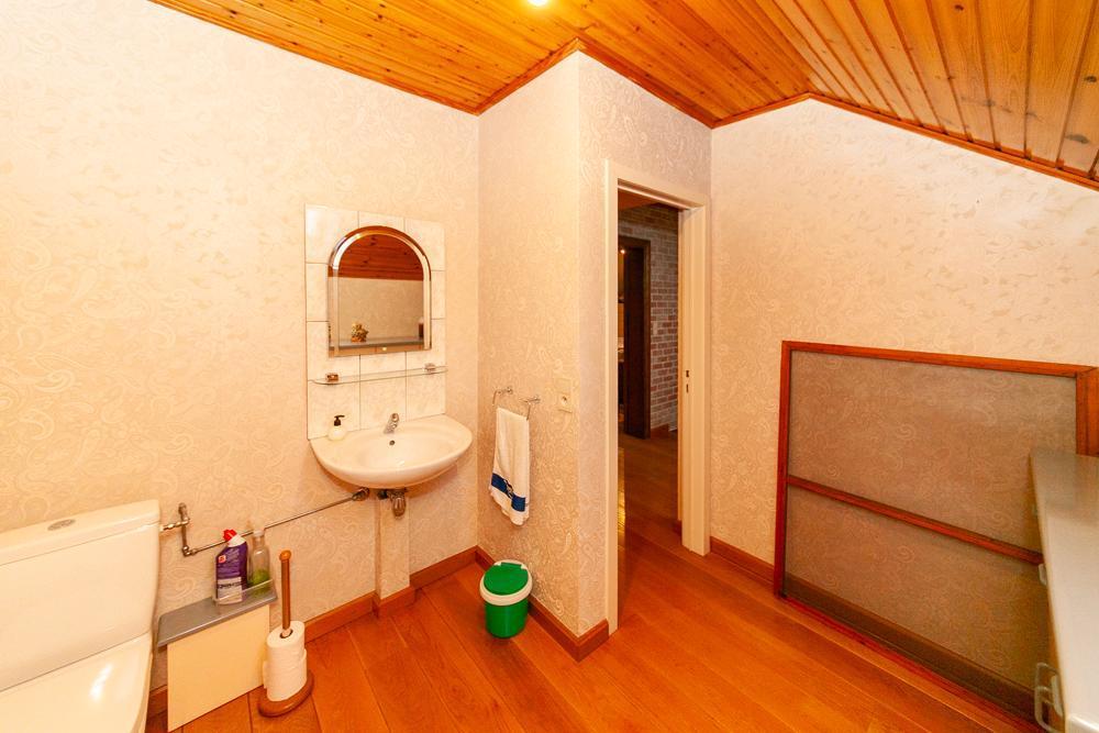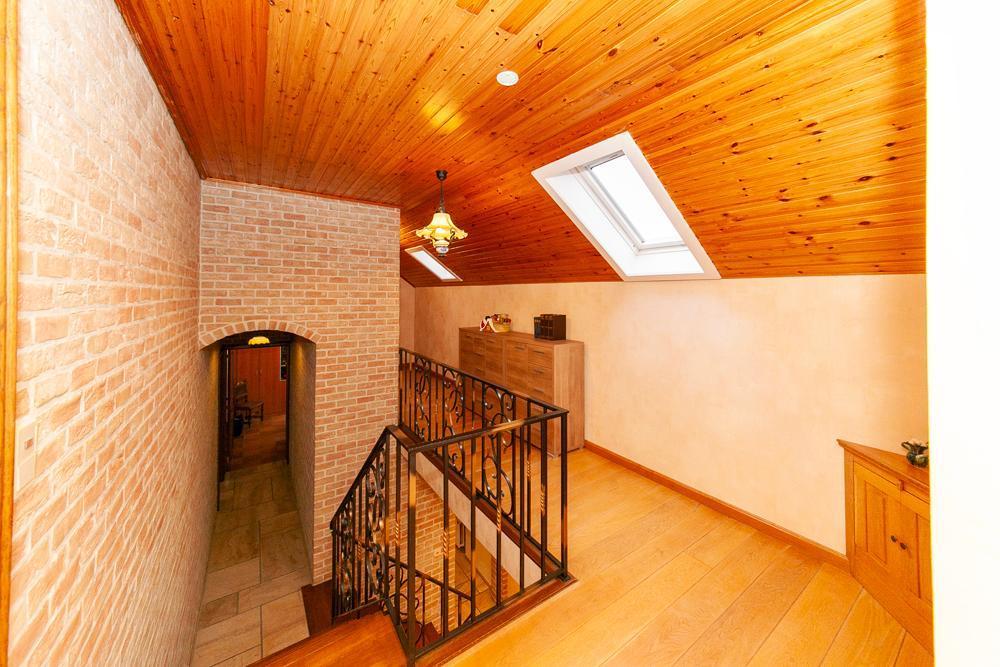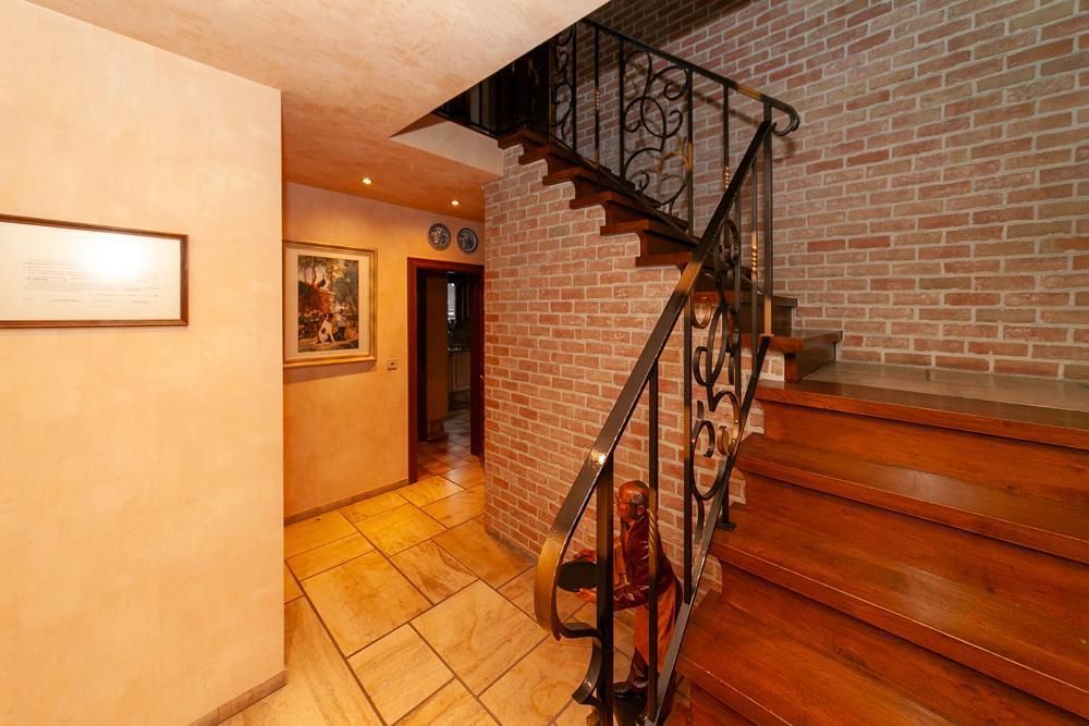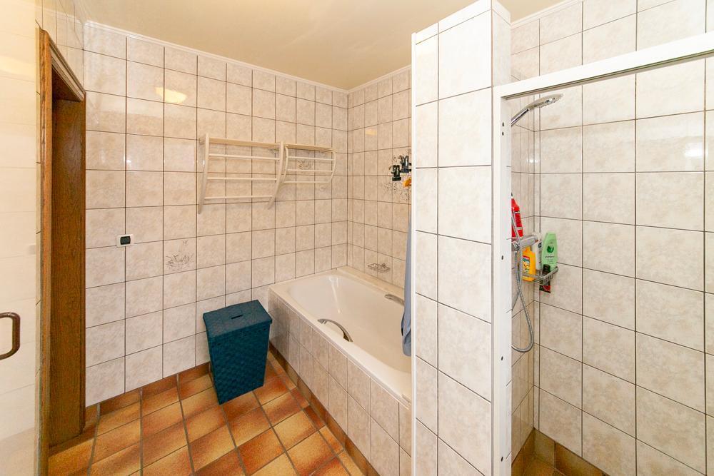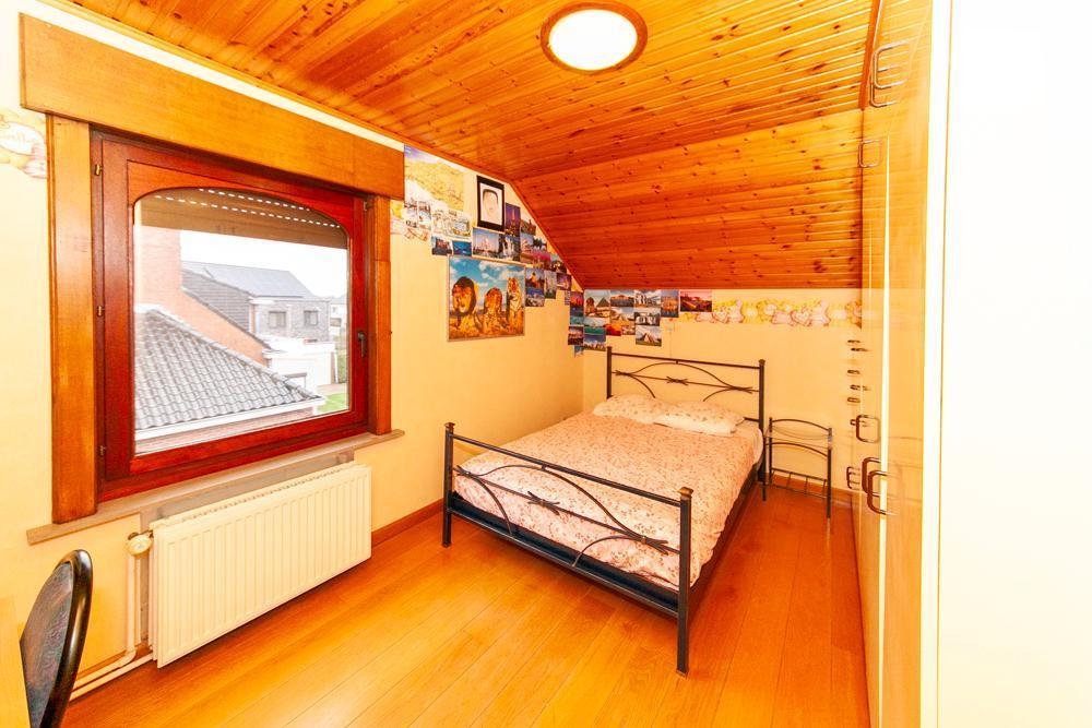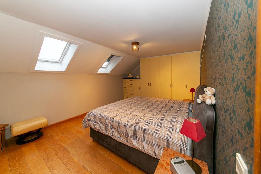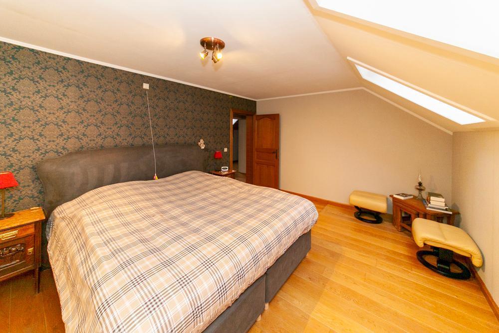 De woning is voorzien van een inkomhall met ruime vestiaire en een gastentoilet Zowel de keuken als de living zijn te bereiken via de eetkamer. De landelijke keuken is voorzien van veel bergruimte en is uitgerust met de nodige apparatuur. Op het eerste verdiep vinden we een bureau, die tevens bereikbaar is via de living. De woning beschikt over 3 ruime slaapkamers, één badkamer, uitgerust met douche en bad, en een aparte kamer met een toilet en lavabo. Vooraan de woning ligt een ruime oprit met garage. De ruime garage is voorzien van inbouwkasten. Achteraan de woning bevindt zich een uitgestrekte tuin met achteraan een tuinhuis. In het tuinhuis is een gezellig open haard aanwezig.