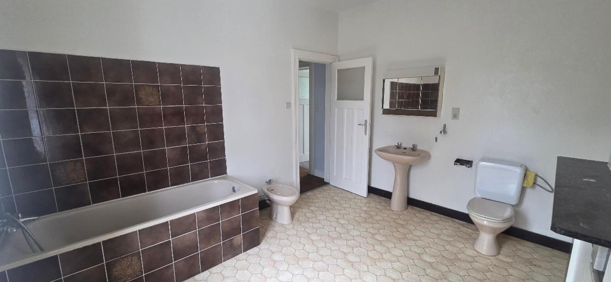 1er ETAGE sur charpente bois – ancien balatum et tapis au sol : hall de nuit de 2,22 m² (1,48*1,50) – une chambre de16,97 m² (4,70*3,61) – une salle de bain, composée d’une baignoire, d’un lavabo et d’un WC)