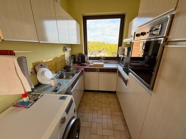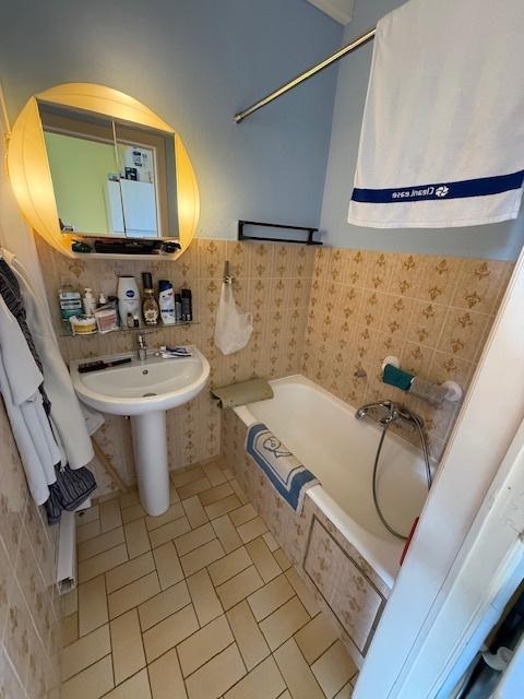 Studio comprenant: couloir avec placards, living - cuisine (double évier, taque électrique, four), salle-de-bain (baignoire, évier), wc avec lave-main