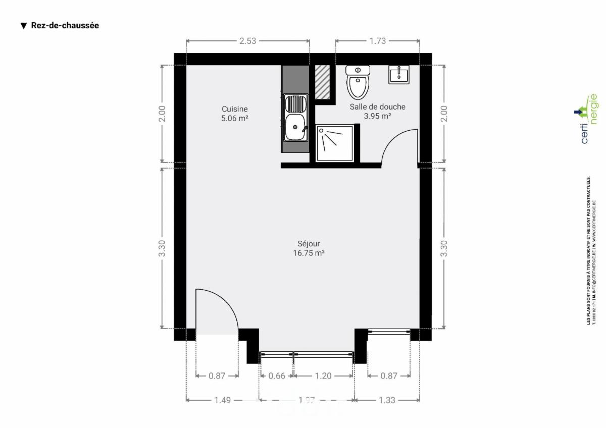 Dans un ensemble immobilier destiné au logement d'étudiants, sis rue des Blancs Chevaux, 33, au niveau du rez-de-chaussée, un studio lumineux de 26 m2 comprenant un séjour pouvant accueillir un coin bureau et un lit. Le séjour donne sur une cuisine ouverte équipée d'un évier, d'un réfrigérateur, d'une taque de cuisson électrique et d'armoires de rangement. Présence d'une salle de douche avec lavabo et toilette.