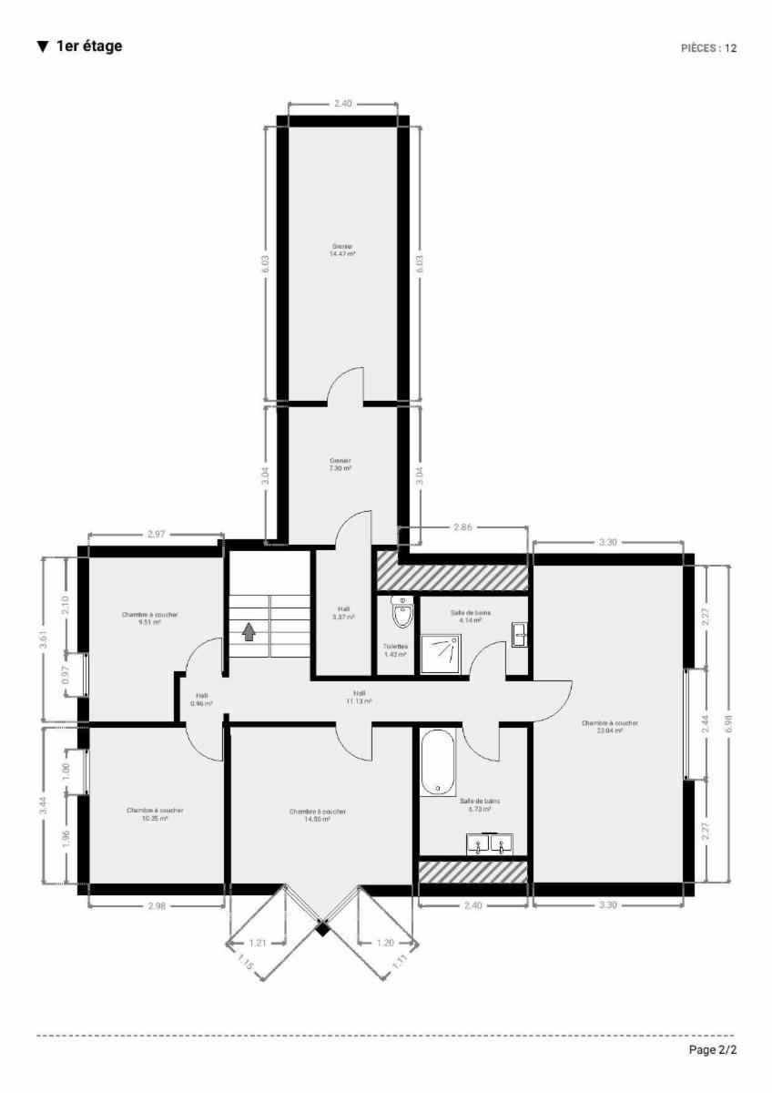 À l’étage, le bien propose quatre chambres confortables, une salle de bains ainsi qu’une salle de douche, répondant parfaitement aux besoins d’une famille. Deux greniers complètent l’espace et offrent des solutions de stockage supplémentaires ou de futurs aménagements.