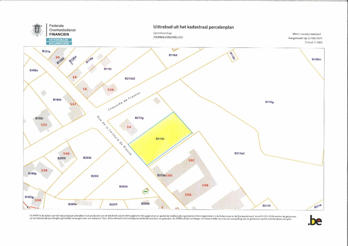 Melles, à front de la rue Couture de Breuze (entre les numéros 10 et 14), beau terrain à bâtir cadastré section B, numéro 212HP0000, d'une contenance de 12a 63ca et présentant un front à rue de 25,50m. Profondeur du terrain : +/- 50,23m. Terrain situé en zone d'habitat à caractère rural. Libre d'occupation. Revenu cadastral: 14 €. Le bien est situé dans le périmètre du permis d'urbanisation n°L89/08/01 non périmé, autorisé par le Collège Echevinal le 07/08/1989. Plan de mesurage + prescriptions urbanistiques en l'Etude. Pour tous renseignements complémentaires, merci de bien vouloir contacter l'Etude au 069/66.60.11.