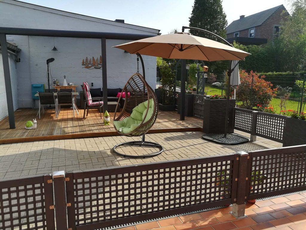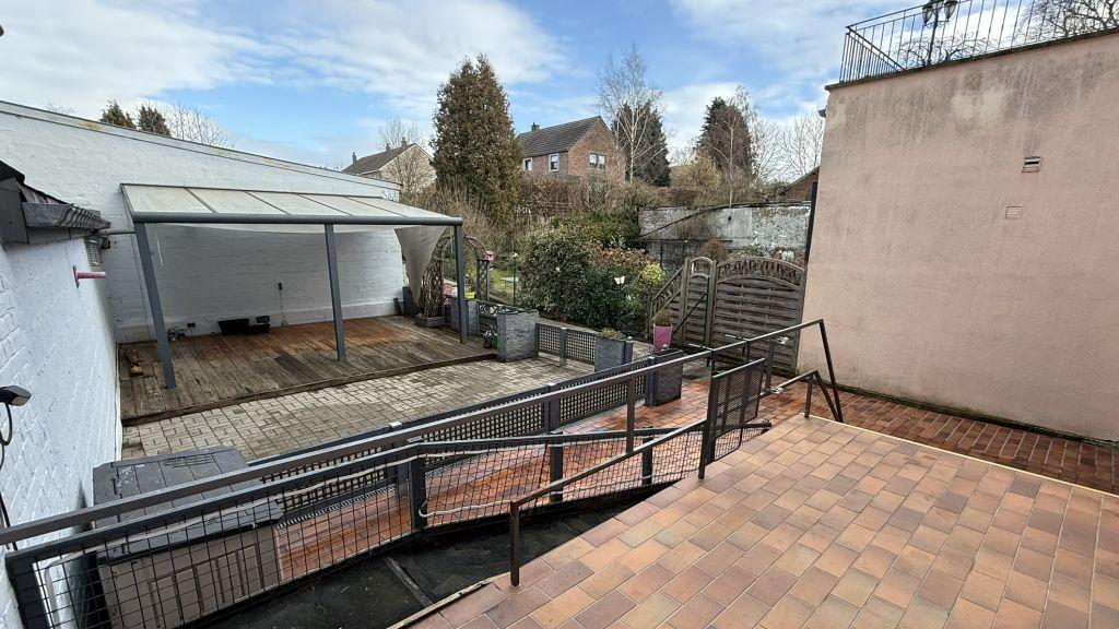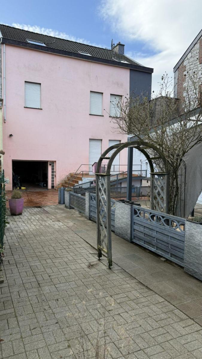 Cour pavée avec pergola en aluminium de 20 m² et terrasse au niveau cuisine/living