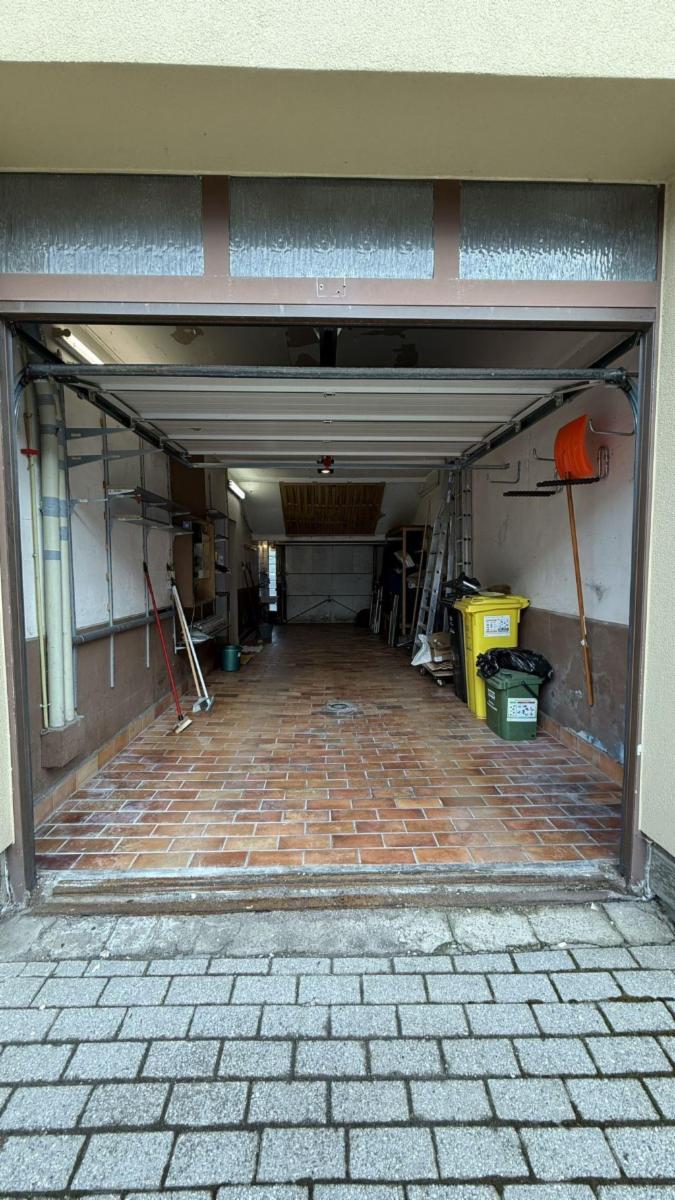 Garage double 9.35 M x 3.20 M – 32 m² - avec porte électrique isolée, deuxième porte vers l’arrière.