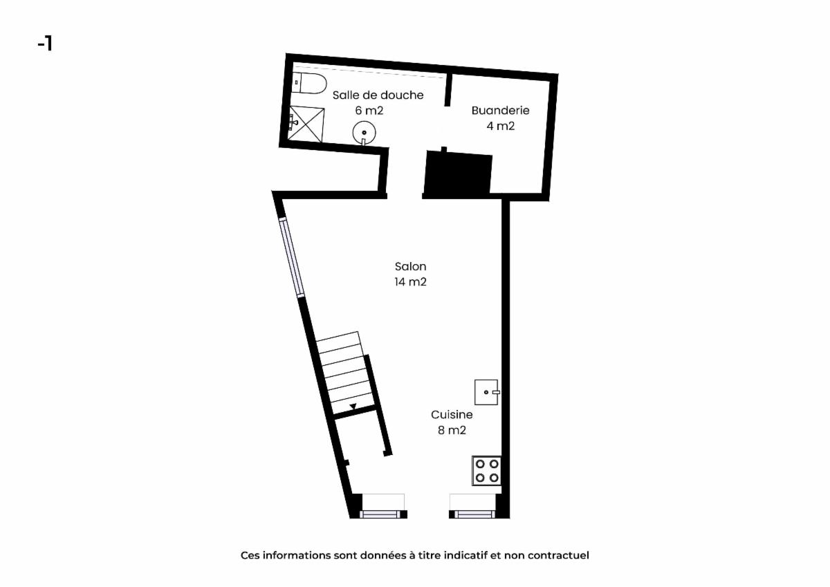– au niveau -1 : un salon, une cuisine, une buanderie, une salle de douche.