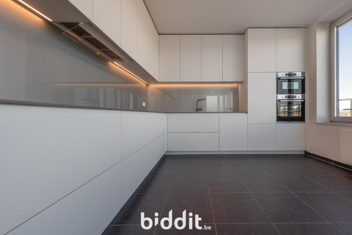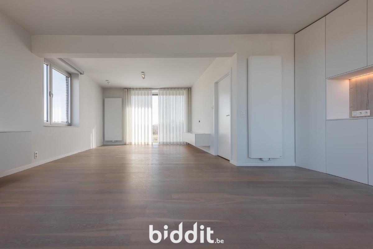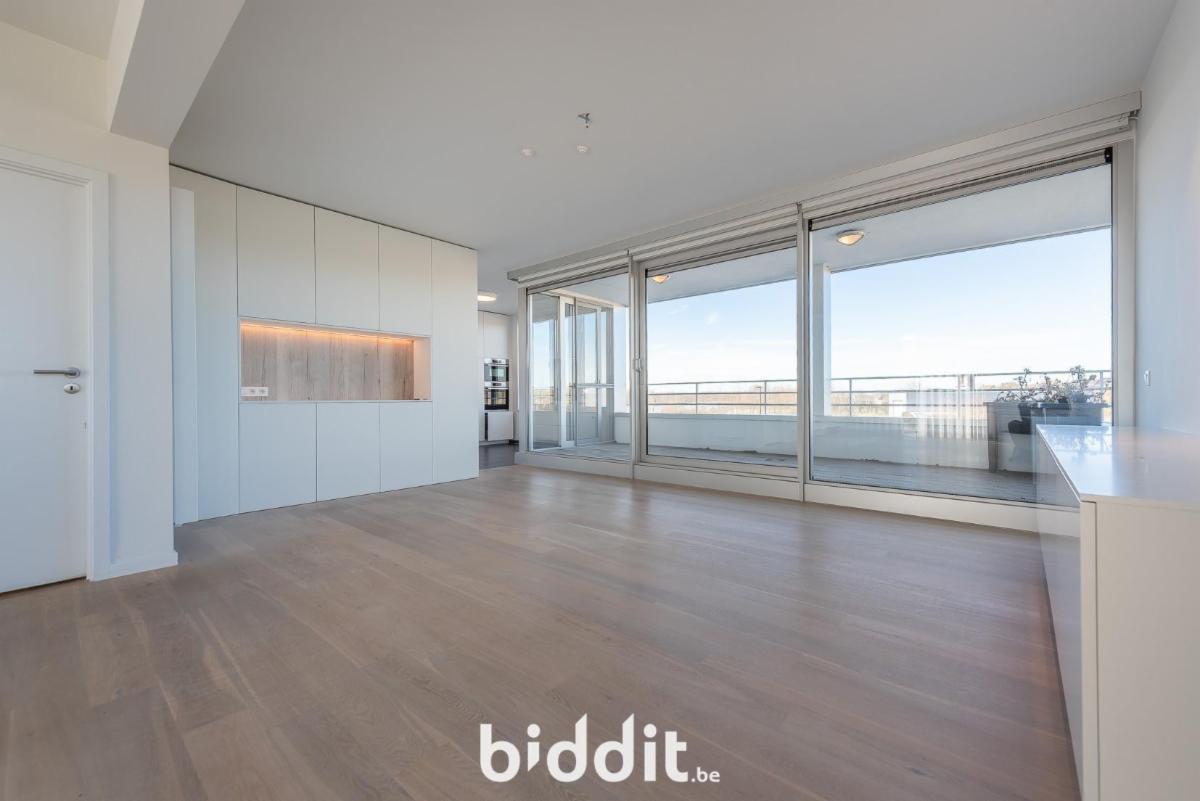De warme parketvloer en het maatwerk van ingemaakte kasten zorgen voor een strakke, uniforme uitstraling doorheen het hele appartement. De ruime en zonnige leefruimte sluit naadloos aan op een overdekt terras van circa 12 m², dat dienstdoet als volwaardige buitenruimte. De moderne open keuken is volledig uitgerust en biedt alle hedendaags comfort.