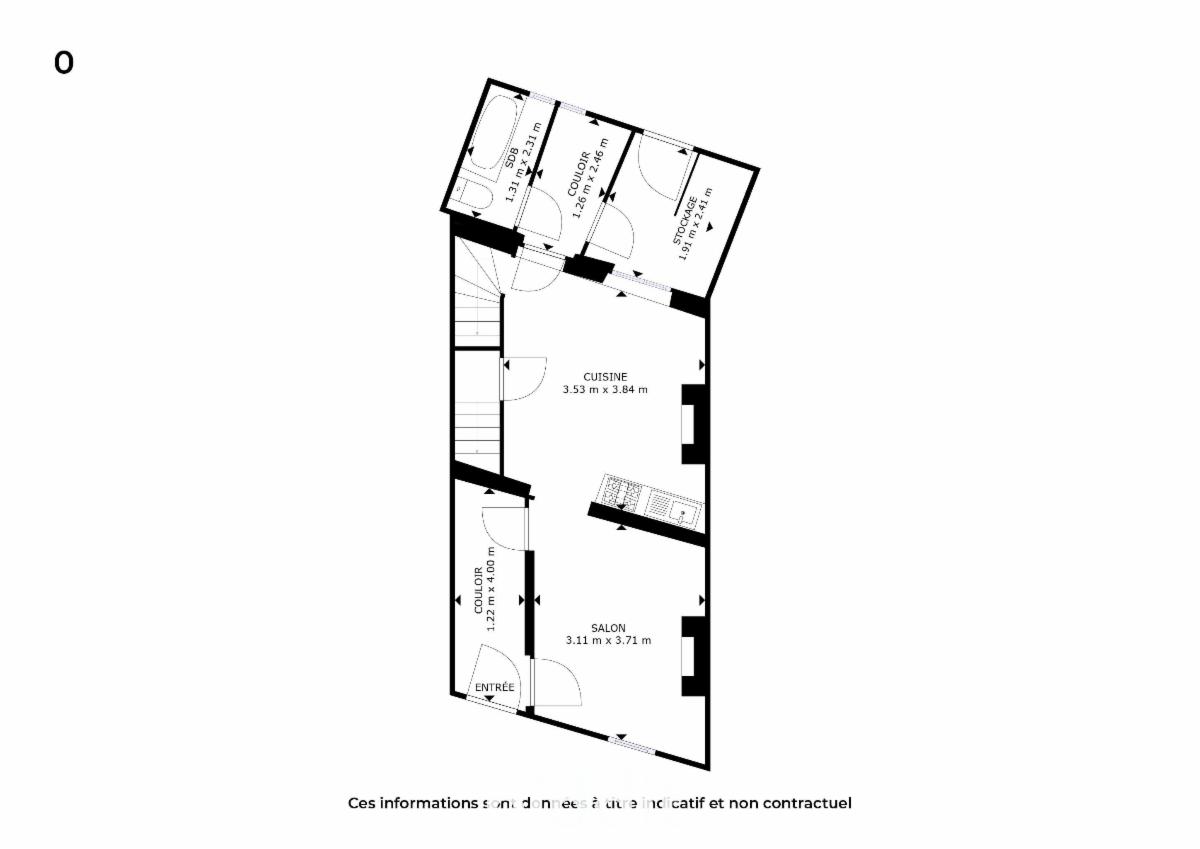 Le rez-de-chaussée accueille un couloir d’entrée menant à un salon lumineux d’environ 11,5 m² et à une cuisine spacieuse d’environ 13,6 m². Un couloir arrière dessert également une salle de bains et WC, ainsi qu’un espace de stockage supplémentaire.