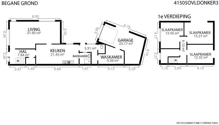 Drie slaapkamers op het verdiep, en een inpandige garage achteraan.