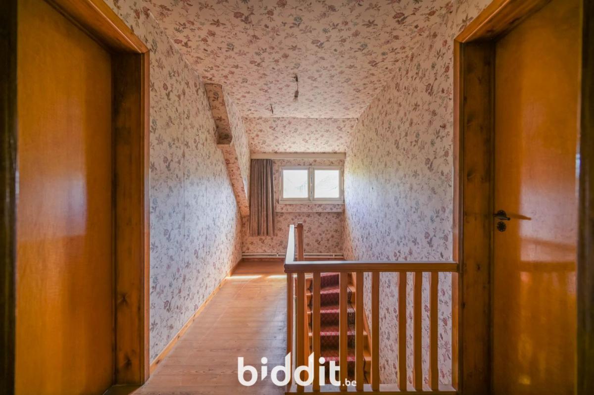 Verdieping: overloop met ingemaakte kast, 3 slaapkamers en badkamer. Hoger: kruipzolder met boiler (defect).